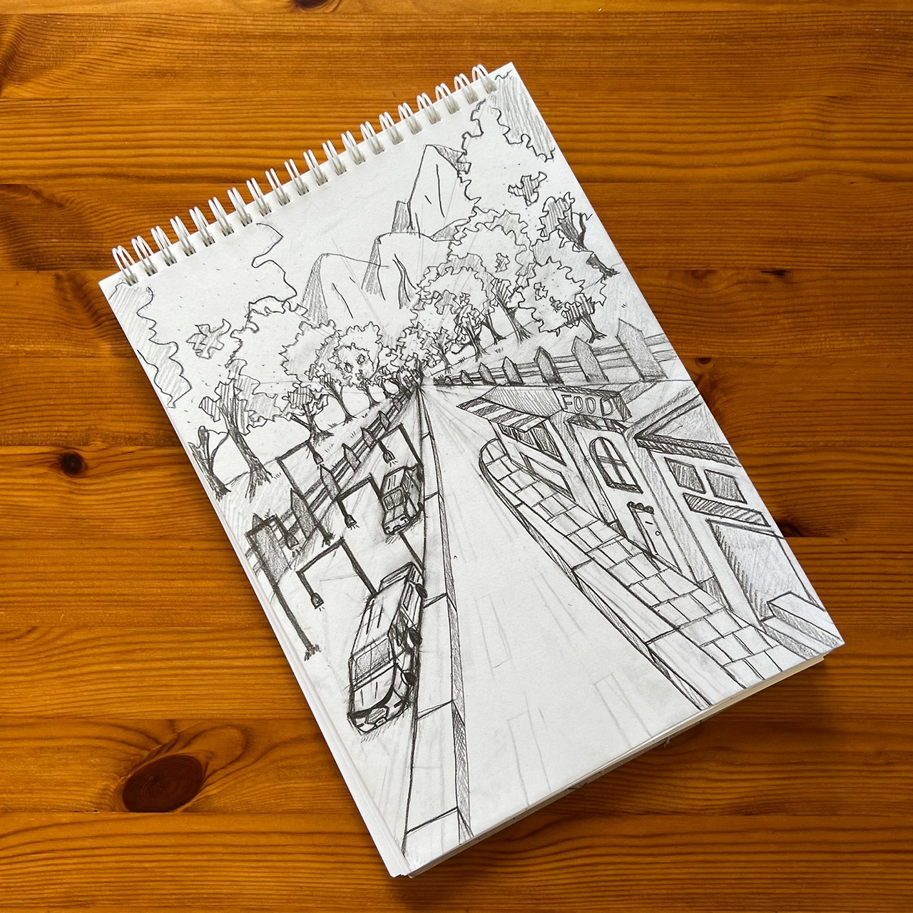 건물과 저기 저 멀리 보이는 뒷산, 보도블록, 가로등 2개를 더 그려 넣었습니다.