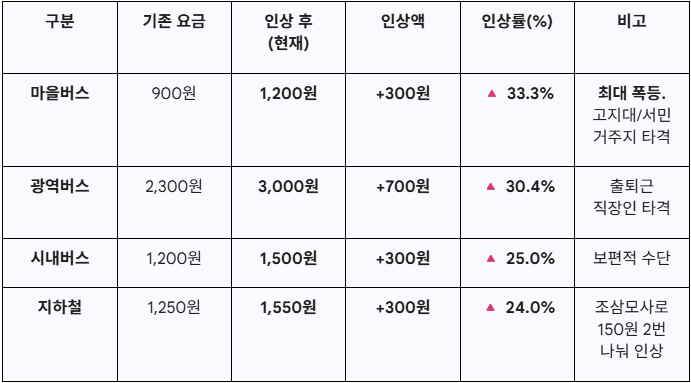 위의 표처럼 모든 대중교통 수단이 최소 24% 이상 폭등했다. 특히, 고지대와 달동네 등 가장 취약한 곳을 누비는 '마을버스'가 33.3%로 가장 높은 인상률을 기록했다는 게 시사점이다.