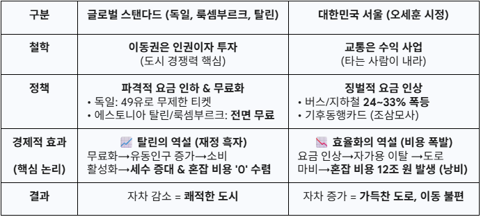 다른 나라들도 마찬가지다. 룩셈부르크는 2020년 세계 최초로 국가 단위 전면 무료화를 단행했고 대만 타이중은 '10km 무료' 정책을 통해 오토바이 지옥을 벗어나 대중교통 중심 도시로 탈바꿈했다. 독일 역시 월 49유로 무제한 티켓으로 전 국민의 이동권을 보장하고 있다.