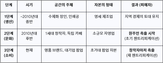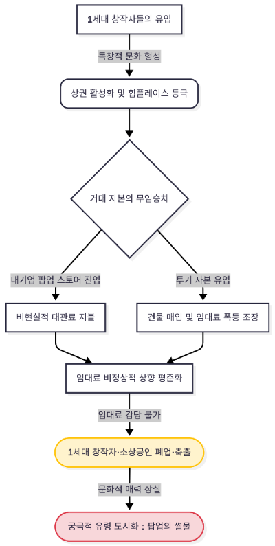 대기업 '팝업 스토어'는 애초에 그곳에서 물건을 팔아 월세를 낼 생각이 없다. 그들에게 수천만 원의 하루 대관료는 단순 '마케팅 비용'일 뿐이다. 자본을 앞세운 왜곡된 수요가 임대료의 천장을 무한대로 뚫어버리며 커피를 팔고 가죽을 다듬어 월세를 내던 1세대 창작자들은 더 이상 버틸 수가 없게 된다.