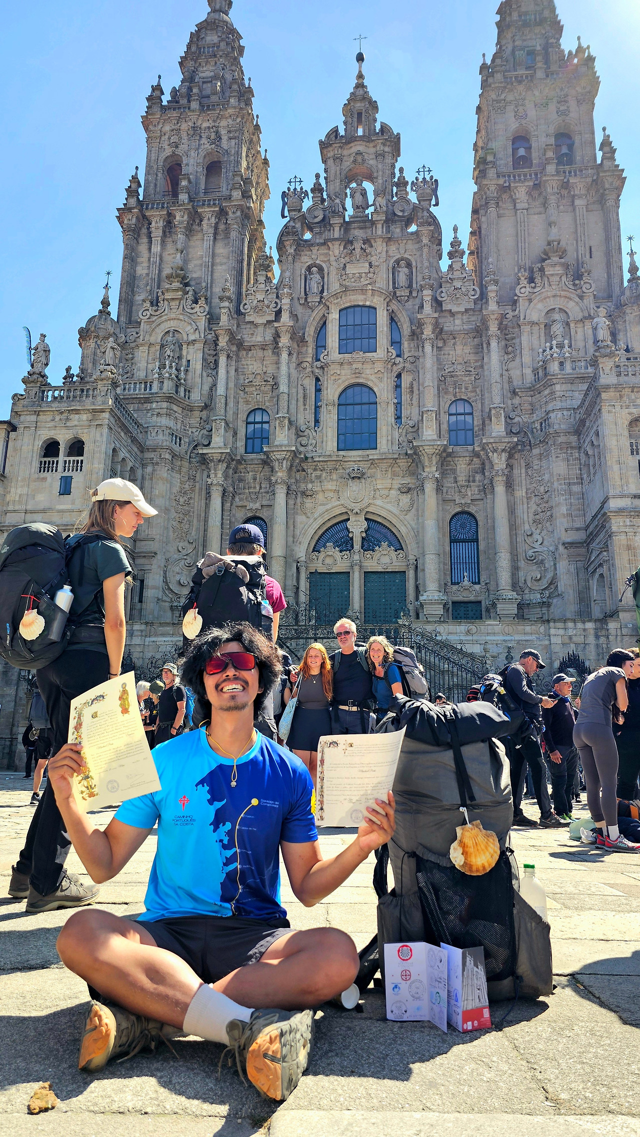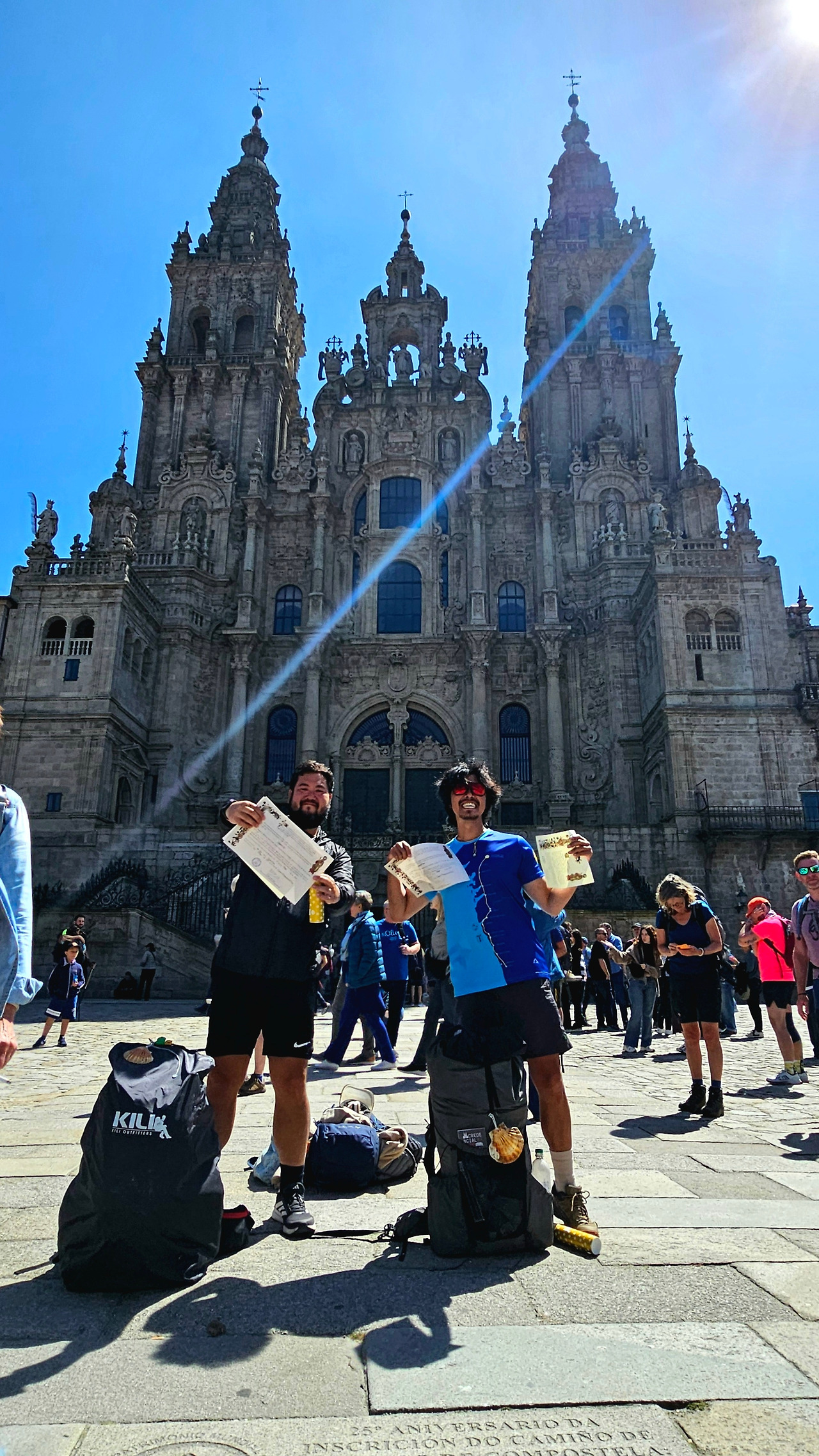 경험자와 함께하니 든든하다. 인증을 받으러 가니 여러 곳에서 시작한 순례자들이 모여 있고 들뜬 마음으로 인증서를 받고 있다. 프랑스길만큼 오래 걷지는 않았지만 인증서를 받으니 왠지 마음이 뭉클하다. 그리고 그대로 대성당으로 올라갔다. 탁 트인 광장에 많은 순례자들이 행복에 들떠 있다. 이렇게 에너지가 넘치는 곳이 또 있을까. 누군가는 기쁨에 소리치고 누군가는 눈물을 흘리고 있다. 우리도 대성당을 배경으로 인증서와 그동안 열심히 모은 도장을 펴서 사진을 찍었다.