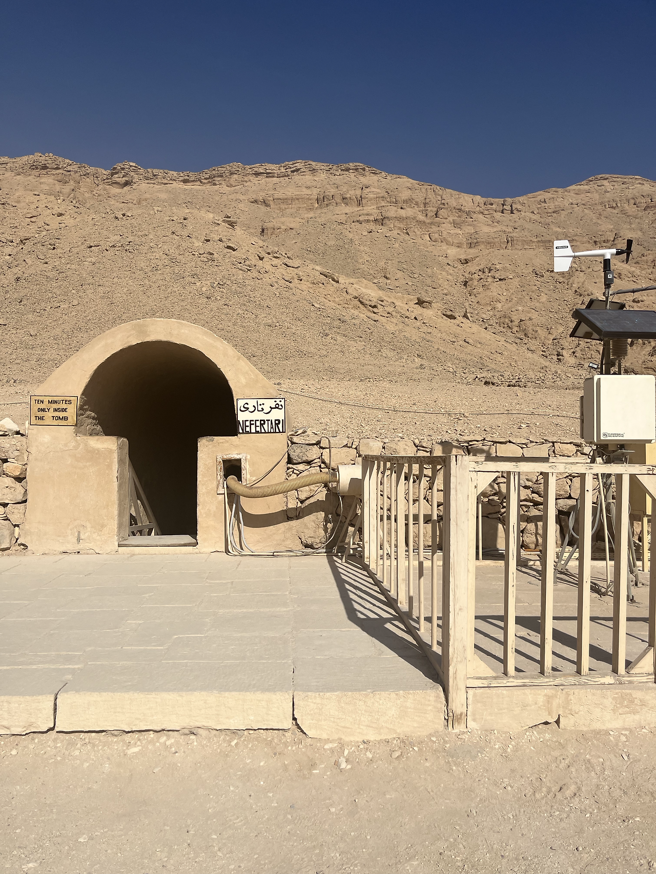 네페르타리 무덤은 이집트 여행을 다녀온 사람이라면 가장 기억에 남는 곳이 아닐까 싶다. 피라미드도 유명하고 스핑크스도 유명하지만 그 다음으로 유명한 곳, 우리가 이집트를 떠올렸을 때 생각하는 화려한 색채로 물들인 벽화와 상형문자, 각종 이집트 고대 글자와 그림들이 가득한 곳. 입구를 내려가는동안에도 떨림이 가득했다. 다만 관광객이 너무 많아 이 네페르타리 무덤은 관람시간 10분으로 제한된다. 무덤 앞을 지키고 계시는 관리자분께서 관광객들을 줄을 세우고 각각 인원 수에 맞춰 그룹으로 나눈 후에 들여보내준다.