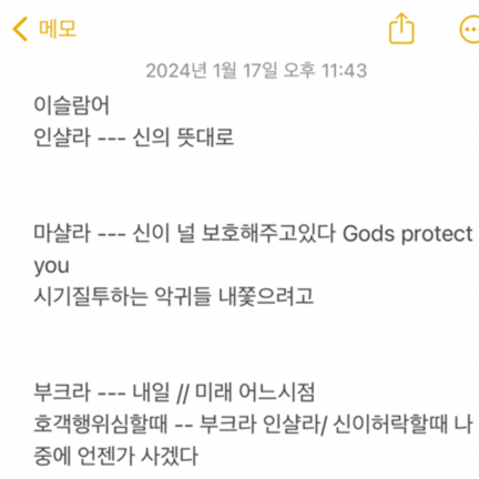 이슬람에서 많이 쓰는 단어인 것 같았다. 이 말이 인상깊어서 여행중에 써먹을 수 있으면 써먹어야지, 여행 후에도 이 단어는 꼭 기억해야지 하고 메모장에 적어놨던 것 같다.