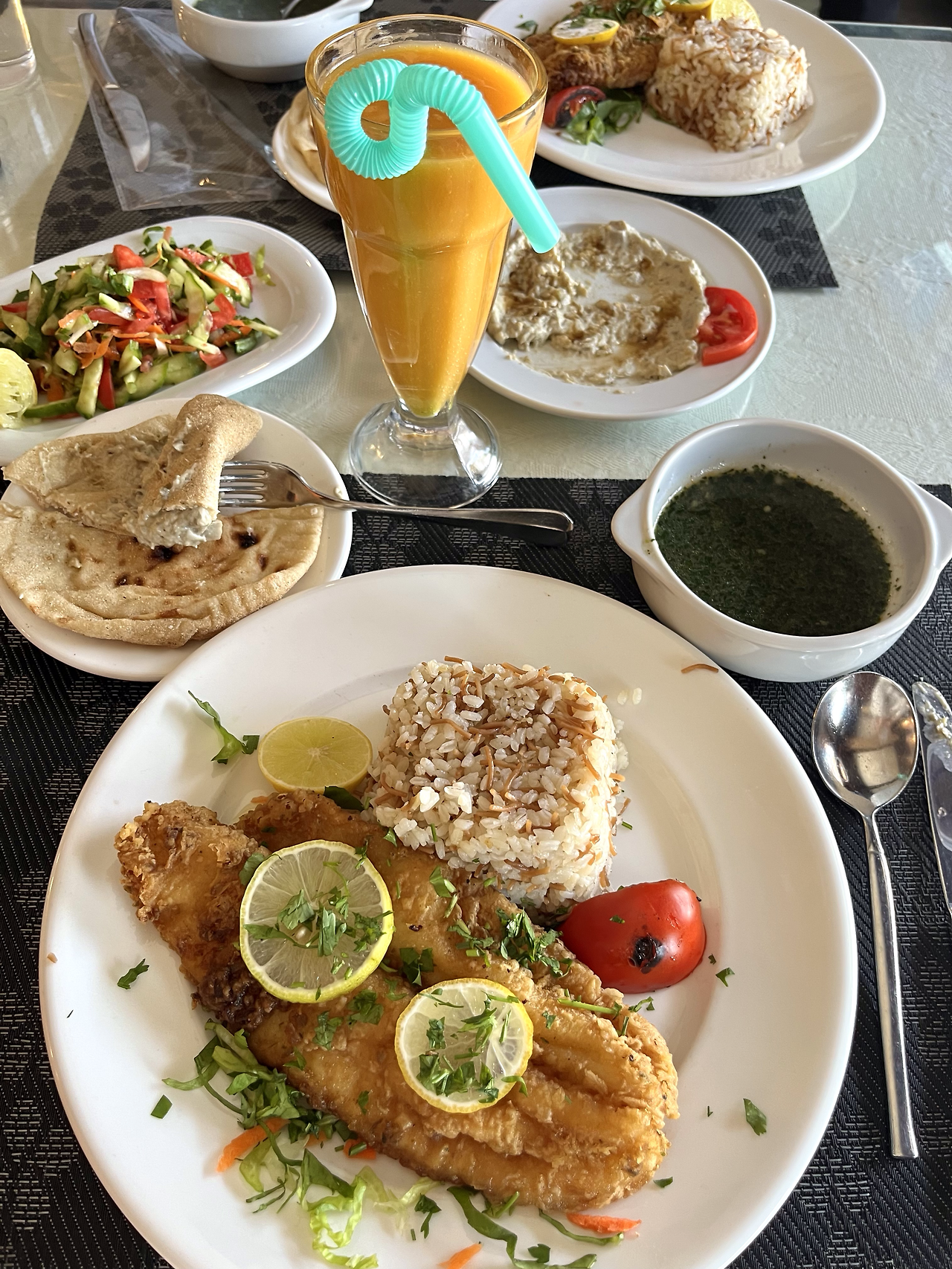 잠시 휴식의 시간을 가지고 조금 늦은 점심을 먹었다. 생선가스 비슷한 그 무언가와 타진, 아이시빵, 그리고 망고 주스. 나는 망고를 썩 좋아하지는 않는데(먹기야 먹는데 굳이 과일 자체를 별로 좋아하지는 않는다.) 이집트가 망고 주스가 워낙 유명하다해서 거의 끼니 때마다 먹은 것 같기는 했다. 걸쭉하고 달달하고 맛은 있었다. 망고를 좋아하시는분들이라면 이 망고 주스 하나로 이집트를 좋아하게 될 것 같았다. 그정도의 힘이 있는 망고주스였다.