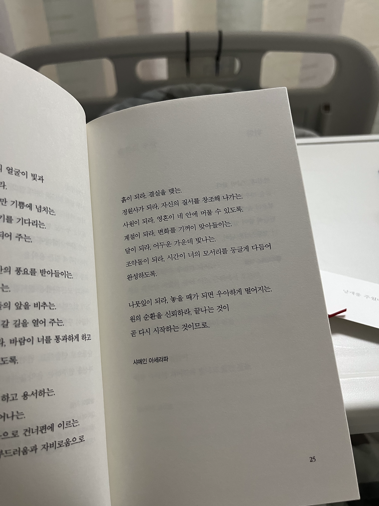 경과를 지켜보며 꾸준한 약물치료와 적절한 운동은 필수이고 증상 악화시에는 병원 방문하여 정밀 검사를 다시 받아야한다는 어찌보면 뻔한 답을 듣고 감사합니다를 외치며 병원을 나섰다. 내일이면 다시 출근을 해야 했다. 아픈건 아픈거고 일은 일이었다. 입원은 입원인거고 퇴원했으면 다시 직장에 나가는 거였다. 그게 일상이었다. 그렇지만 그 날 퇴원수속을 밟고 본가 집으로 돌아가 엄마가 차려준 밥을 먹고 약까지 털어 먹은 뒤 한숨 자기 위해 침대 위에 누워 생각하기를, 입원동안 읽었던 책 내용을 떠올렸다.