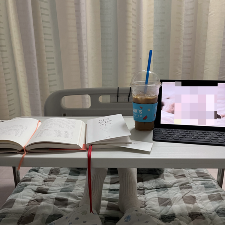 2022년이면 코로나로 아직 마스크 착용과 함께 보호자 면회가 모두 제한되던 때이다. 입원할 것 까진 생각을 못했었기에 급하게 엄마에게 연락해서 내가 입을 옷 몇 벌과 읽을만한 책, 그리고 근무관련해서 사용할 아이패드를 부탁하고 병원 1층에서 물건을 넘겨받았다. 갑작스러운 입원으로 출근 자체는 보류된 상태였지만 그렇다고 해서 내 업무 자체가 보류된 건 아니었다. 해야할 일들이 있었고 남겨진 일들을 조율하고 처리해야 했다. 이때는 사실 좀 슬픈 마음도 들었는데 임상에서 많은 시간을 보내며 아파도 쉬지 못하고 입원조차 못하고 고열에도 근무를 이어가던 지난 날들을 떠올려봤을 때는 그래도 입원치료를 하고 있는게 어디냐, 라는 생각이 들었다.