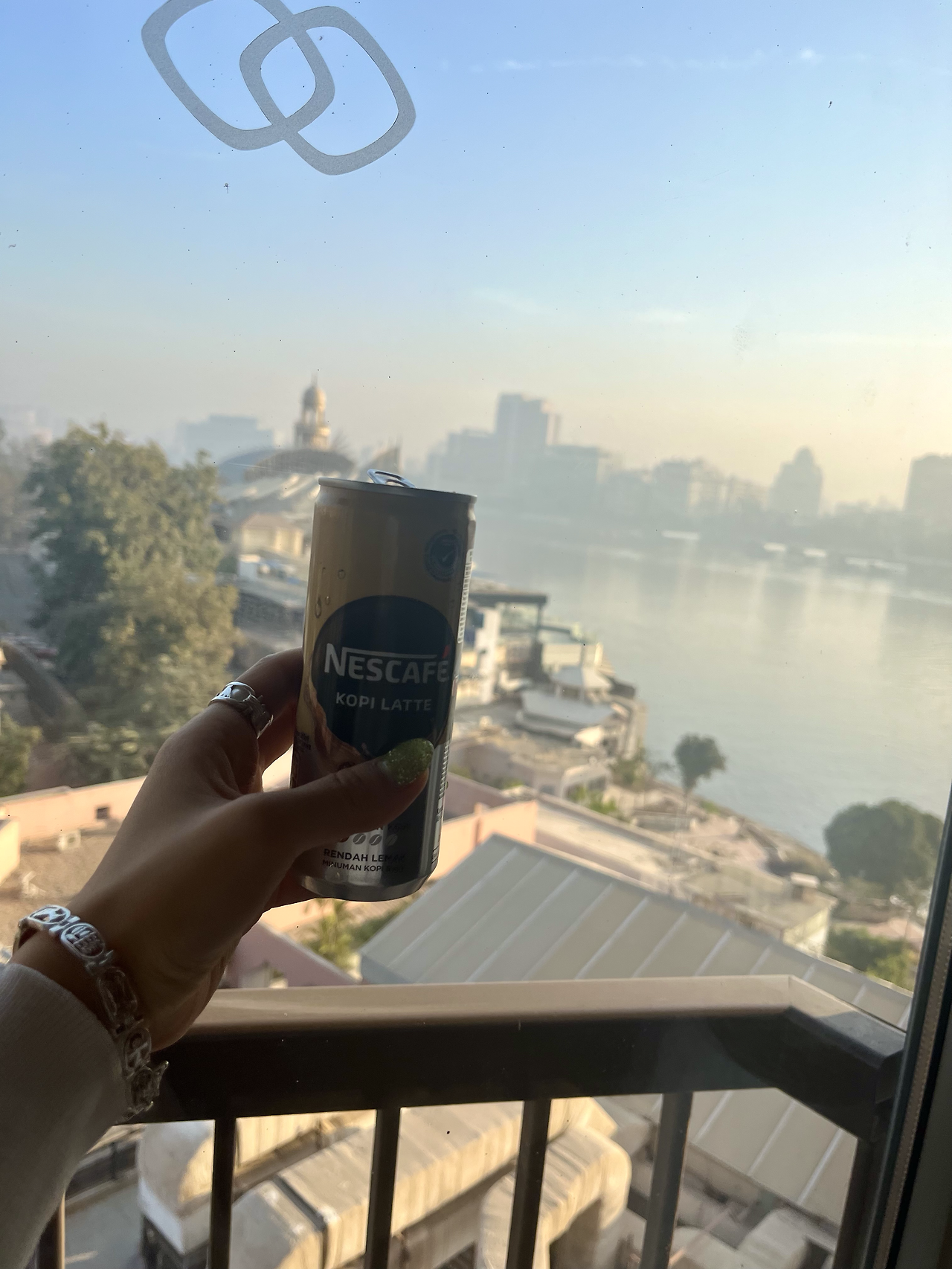 카이로의 아침 햇살을 온몸으로 맞으며 새벽 5시에 일어났다. 조식을 포기하고 마지막 아침을 호텔 방안에서 나홀로 여유롭게 캔커피 한잔으로 시작하고 싶어서 어제 휴게소 마트에서 미리 사두고 밤새 냉장고안에서 열을 식힌 네스카페와 비스킷을 주워먹으며 창밖 풍경의 나일강과 함께 해가 떠오르는 모습을 감상했다.