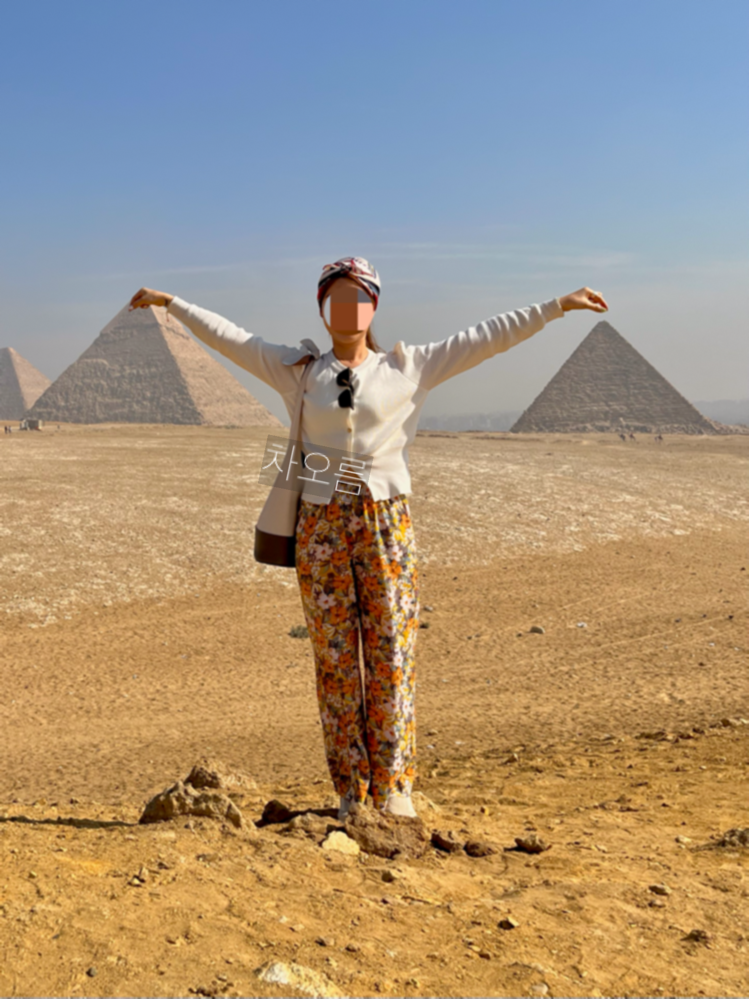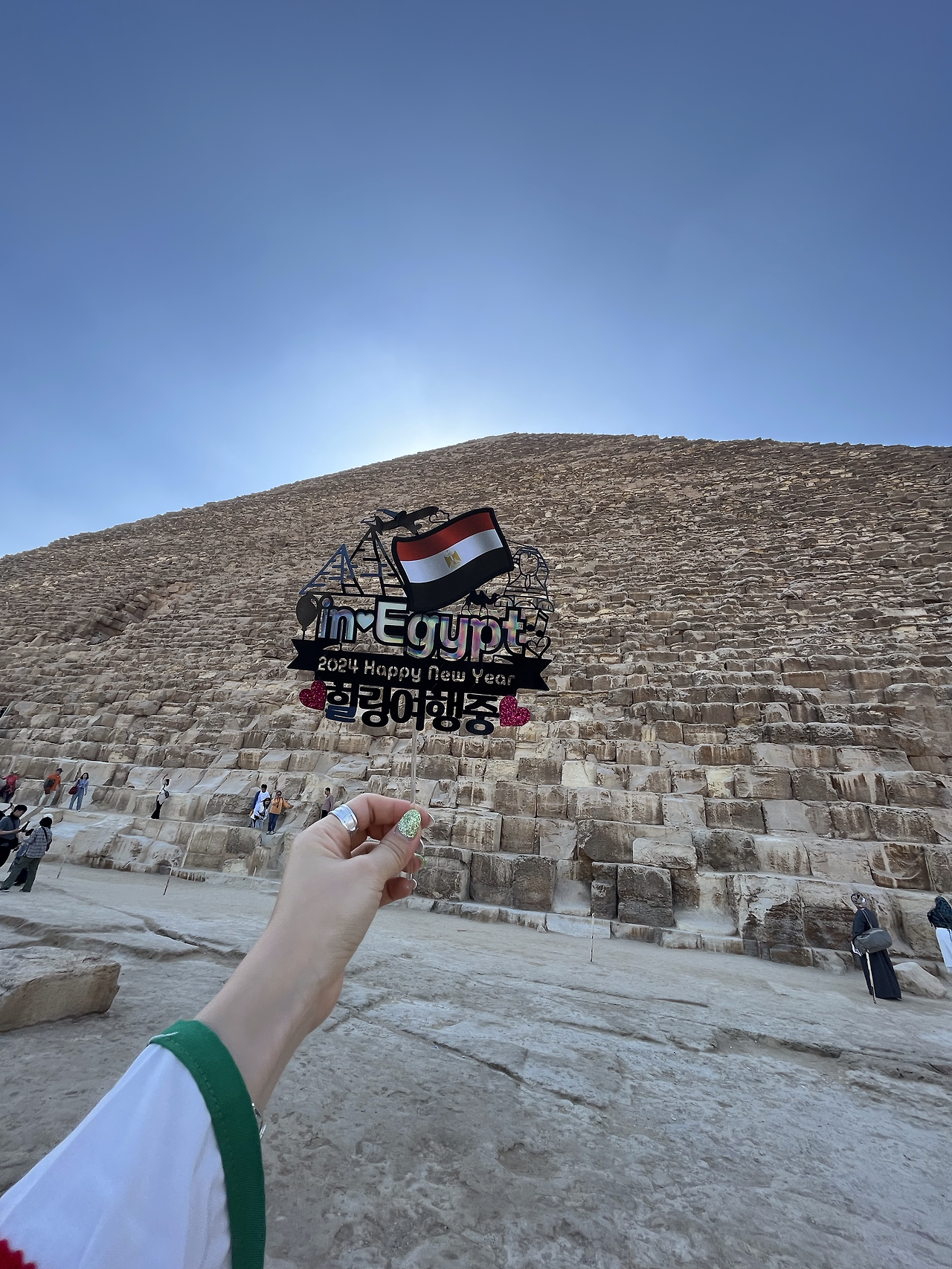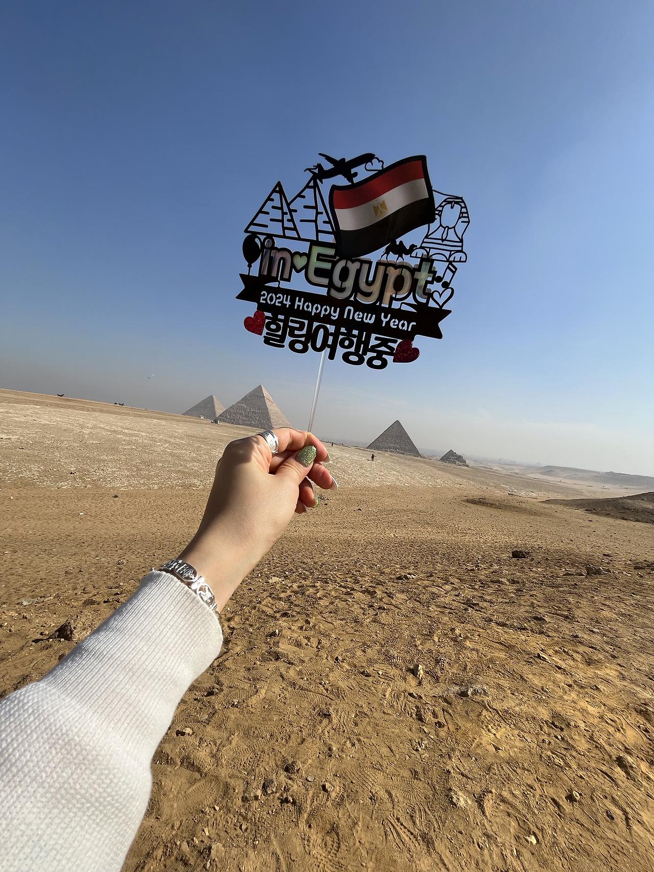 결국 나는 셀카를 찍다가 도저히 피라미드가 잘 담기지 않아 포기하고 멋진 풍경을 눈에 담아가기로 했다. 죽지도 않고 또 온 이집트 여행 스틱(아직도 이름을 모른다)을 꺼내 마지막으로 피라미드 앞에서 손을 높게 뻗었다. 뒤에는 여전히 대일밴드로 급하게 응급처치를 한 탓에 언제 떨어질지몰라 달랑거리는 스틱이었지만 오늘이 마지막이니 제발 좀 버텨줘를 외치며 빠르게 사진을 촬영했다. 결과는 만족스러웠다
