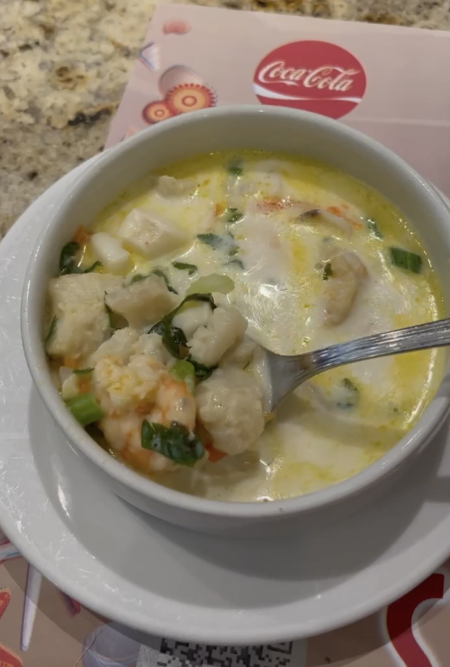 해산물 모둠을 기다리며 먼저 나온 구아바 주스 한 잔과 함께 아이시빵을 맛있게 씹어먹고 있었다. 에피타이저로 해산물 스프가 먼저 나왔는데 정확한 이름은 모르겠지만, 별 기대하지 않았는데 스프 안에 내용물이 가득차서 정말 맛있고 고소했다. 크림파스타와 스프의 중간정도 되는 맛에 아낌없이 넣은 해산물이 일품이었다. 다음에 해산물을 좋아하시는 부모님을 모시고 꼭 이곳에 들려야겠다고 다짐했다.