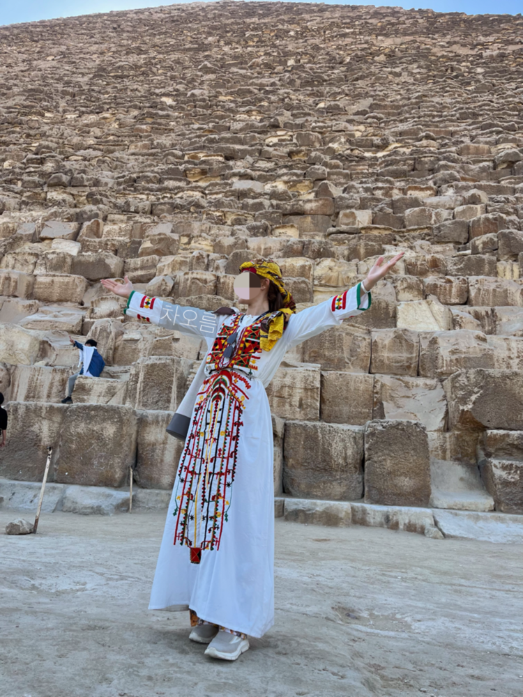 잘나오든 못나오든 피라미드와 함께 내 사진을 남기고 싶기는 했지만 아니어도 괜찮다는 마음으로 사실 처음에는 괜찮다며 현지인의 촬영 의사를 거부했는데 계속되는 실랑이 끝에, 그리고 좋은 협상 끝에 나는 1달러의 가격으로 사진 10장 가까이를 얻을 수 있었다. (보통은 1-2달러로 사진 한장을 찍어준다고 하는데 운 나쁜 경우에는 휴대폰을 가지고가 사진을 여러장 찍어주고 그 장수 만큼 돈을 요구하는 현지인도 있다고 들었다. 물론 다 그런건 아닐테지만! 여러 후기들을 통해 확인한 이야기라서 혹시나싶어 남겨본다)