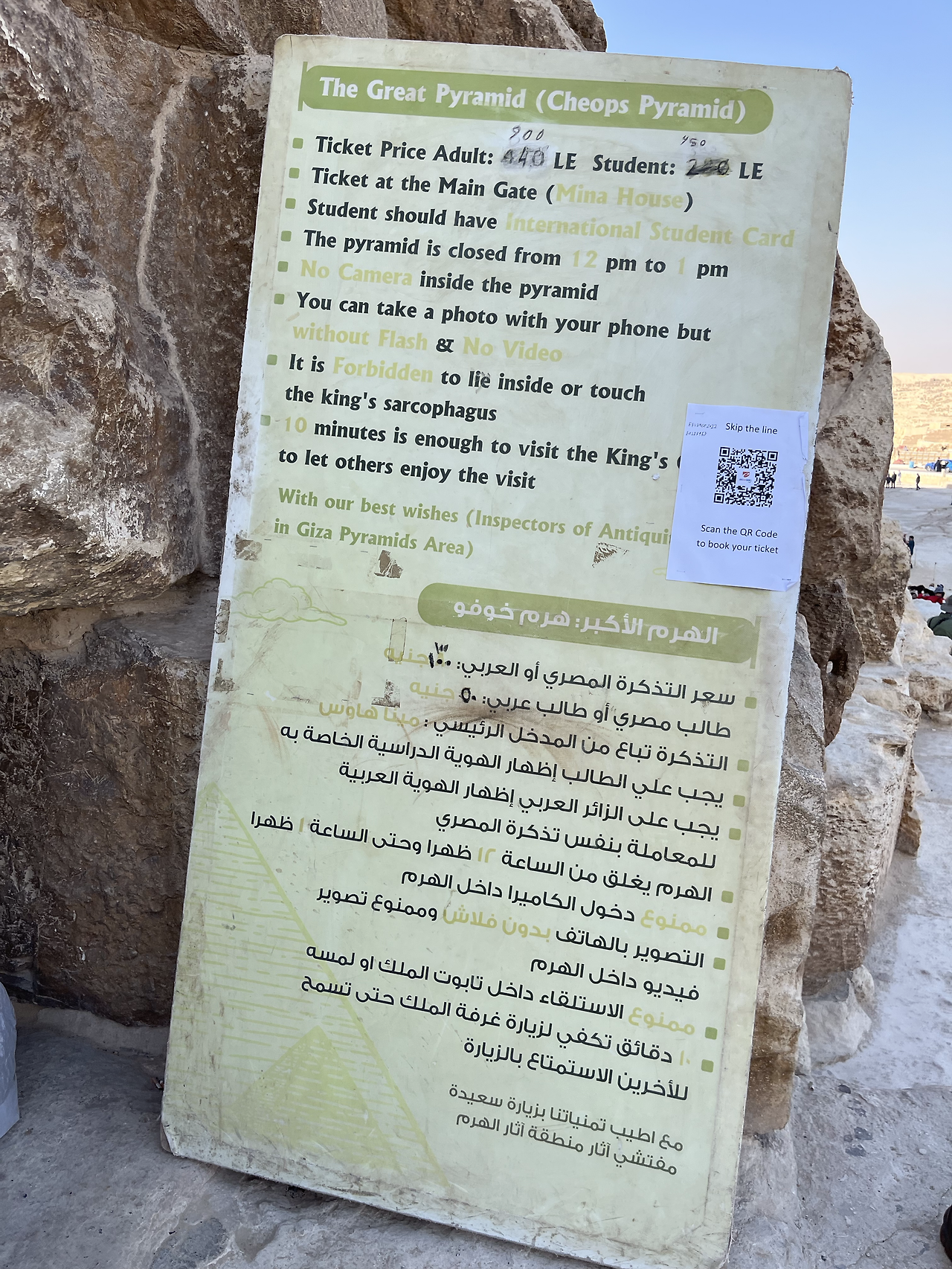 피라미드 관람만을 위한 입장권이 있고, 우리가 흔히 알고있는 가장 큰 피라미드 쿠푸왕 피라미드 내부를 들어가기 위한 입장권은 또 따로 있다. 금액이 다르다. 여기까지 온 이상 내부를 들어가기로 마음먹었다. 쿠푸왕 피라미드 내부가 어떤지는 대충 어느정도 후기를 찾아보고 온 상태였다.