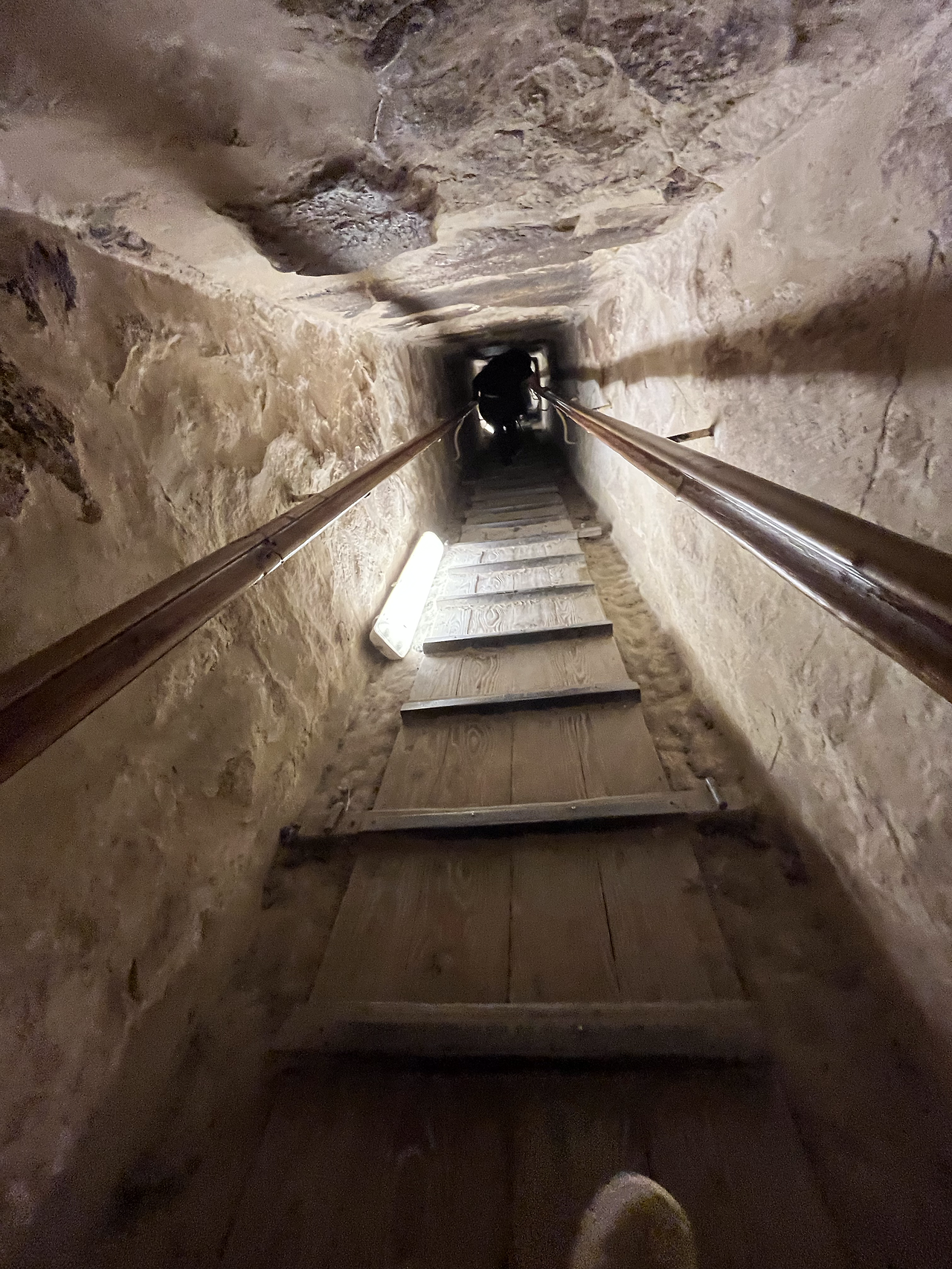 이 글을 읽게되시는 독자님들중에 이 계단이 대충이라도 상상이 되실지 모르겠다. 이전 왕가의 계곡에서 무덤 내부를 입장하면서 익히 연습했던 계단 입장이었는데 역시 쿠푸피라미드 내부는 가는길마저 쉽지 않았고 그 몇 배의 고통과 위험을 수반했다. 당연했다. 관람을 위해 만들어진 입구가 아니라 도굴꾼들이 파놓았던 길들이었기 때문이다. 이 좁은 길을 드나들었을 도굴꾼들을 생각해보면 어이가 없다가도 그 후에 이렇게 관광객들의 관람을 위해 정비된 길이 유지되고 있는것이 신기하고 놀라웠다.