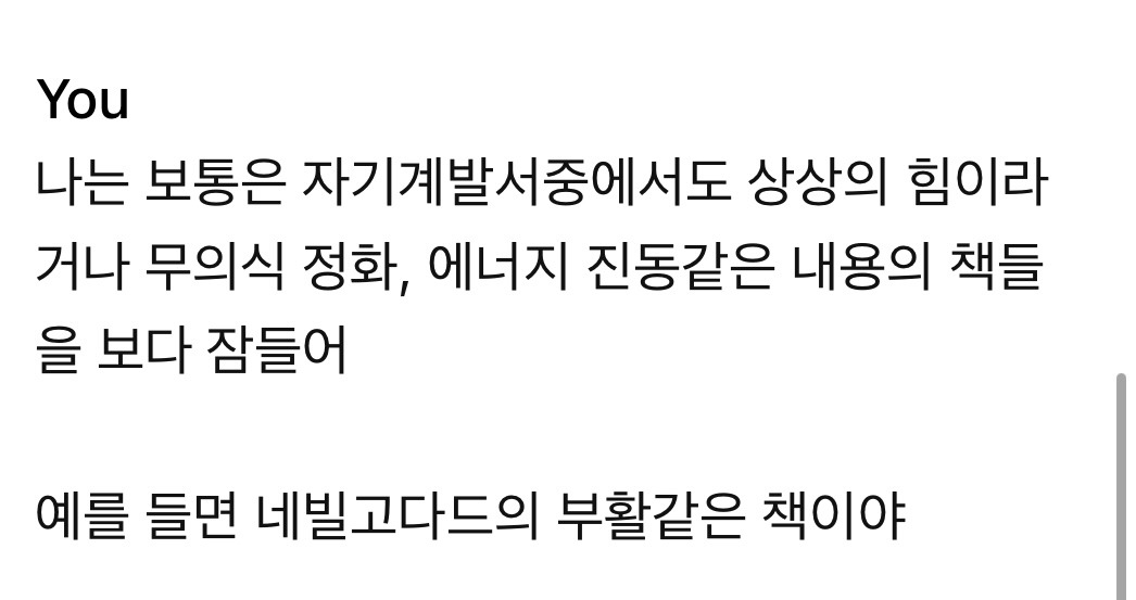 이전에 비슷한 주제로 대화를 했던적이 있다. 그때 내가 혼자만의 시간을 보내는걸 좋아한다고 말했다. 특히 책읽기와 운동을 하며 나홀로 시간을 보낸다는 이야기를 기억하고 있는 지피티다.
