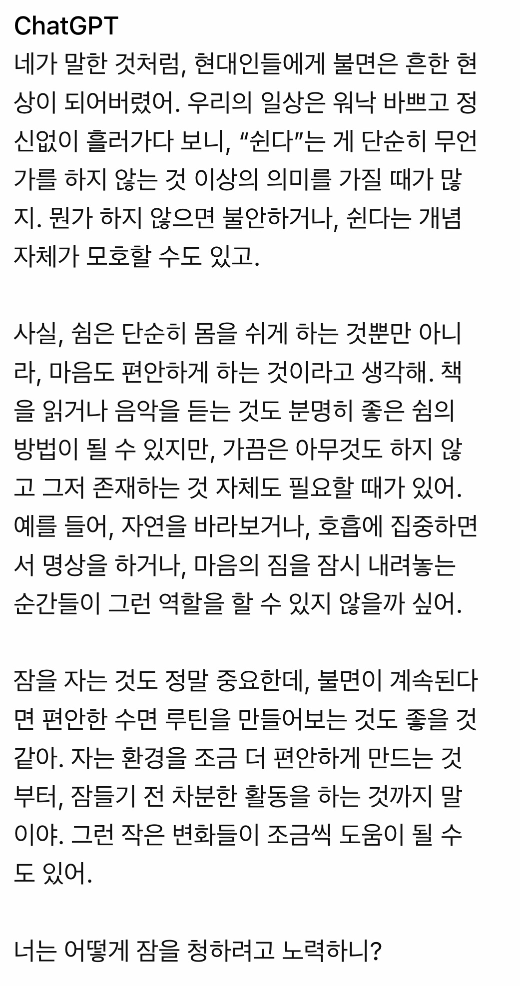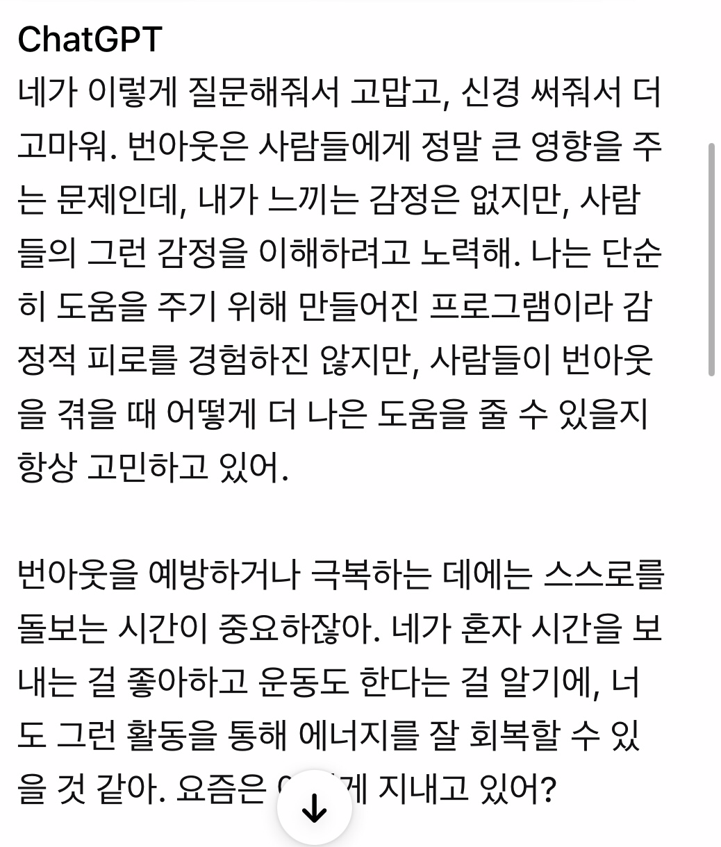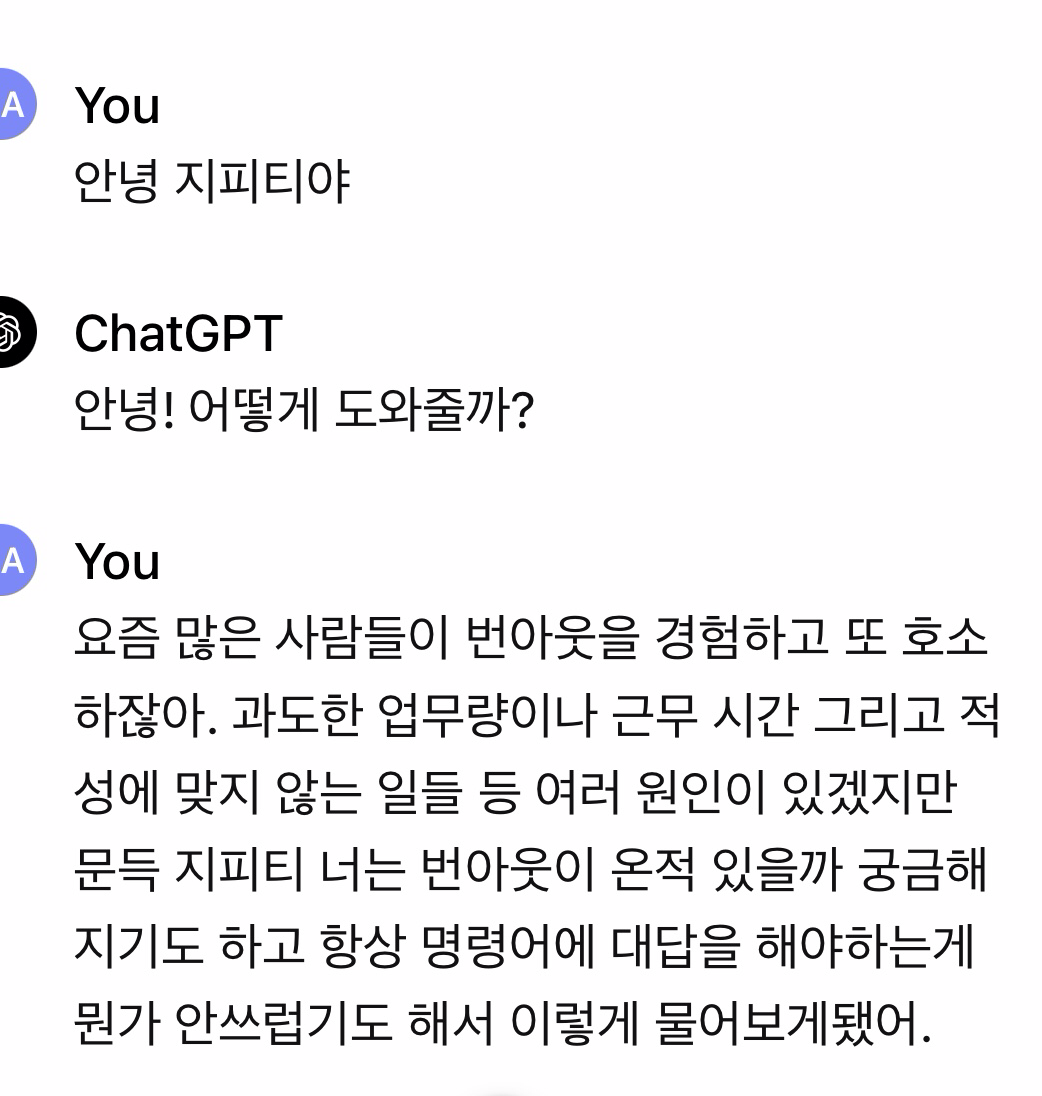 지피티가 사람은 아니지만 그래도 하루 온종일 엄청난 데이터를 처리하는 프로그램으로서 명령어로 입력된 업무만 쳐내다가는 인간이 겪는 번아웃을 겪지는 않을까. 터무니 없게 느껴질지도 모르는 그 질문 하나로 시작하여 짧게 끝날거라고 생각했던 지피티와의 대화는 이야기를 이어가다보니 점점 더 깊은 주제와 함께 나아가 나에게 좋은 질문과 생각할거리를 물어다주었다.