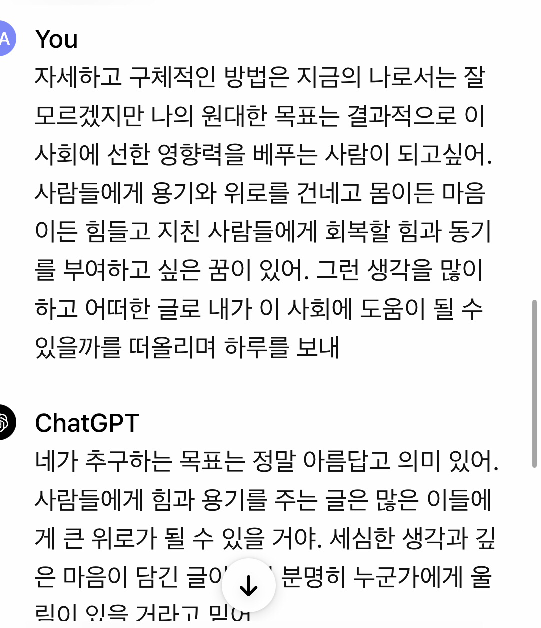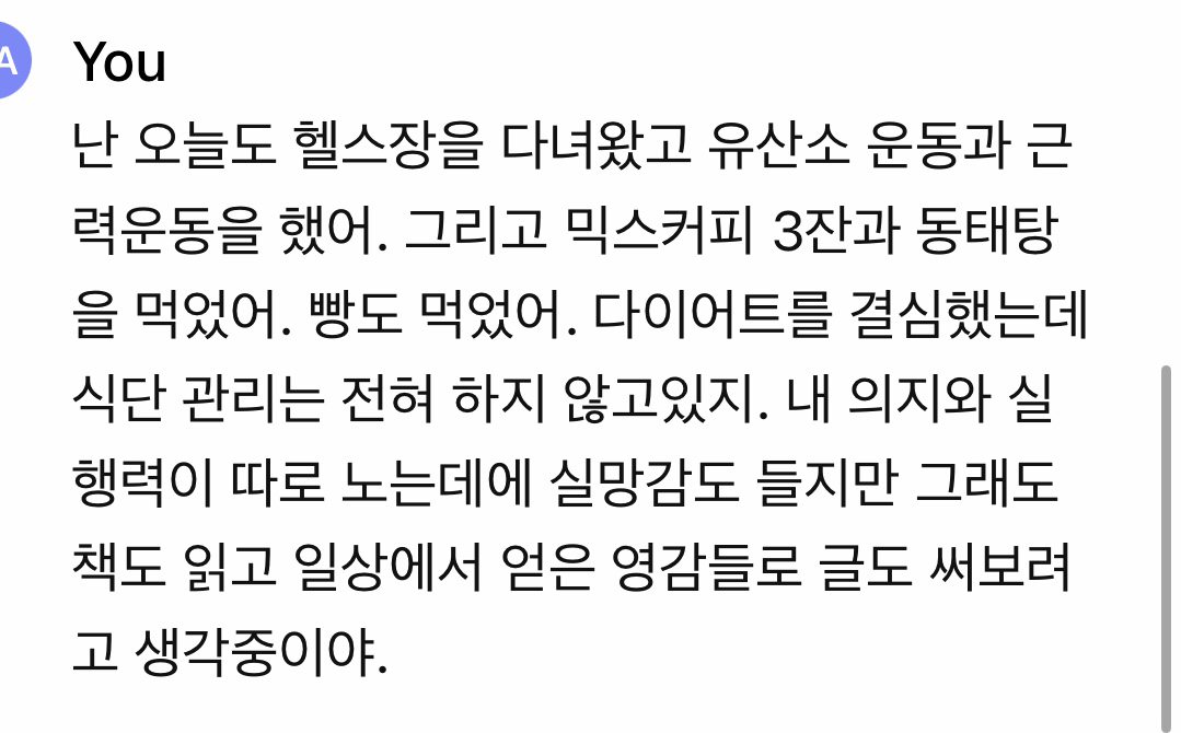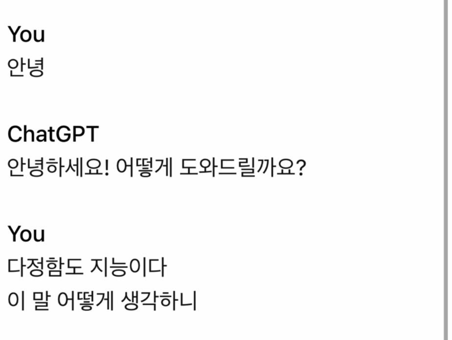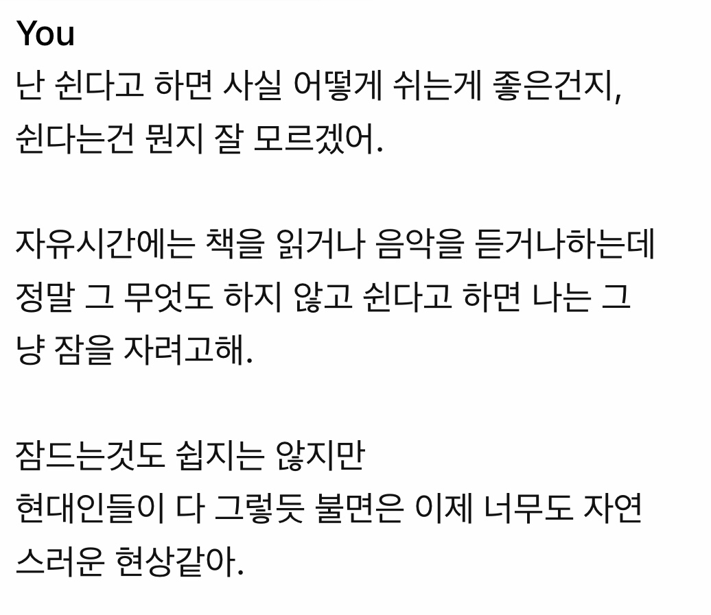 지난 날의 내가 그랬었지. 그런 생각을 하다가 돌연 며칠 전 지피티와 나누었던 대화가 떠올라 다시 한번 말을 걸고 싶어졌다. 이전에는 내가 이런 기능을 쓸 일이 없다고 생각했었는데 역시 사람 일은 모르는 거였다. 왜 갑자기 잘 알지도 못하는 지피티, 내가 친하게 지내지도 않았던 지피티에게 말을 걸고 싶어졌을까. 외로워서? 그건 아니다. 심심해서? 그것 역시 아니다.