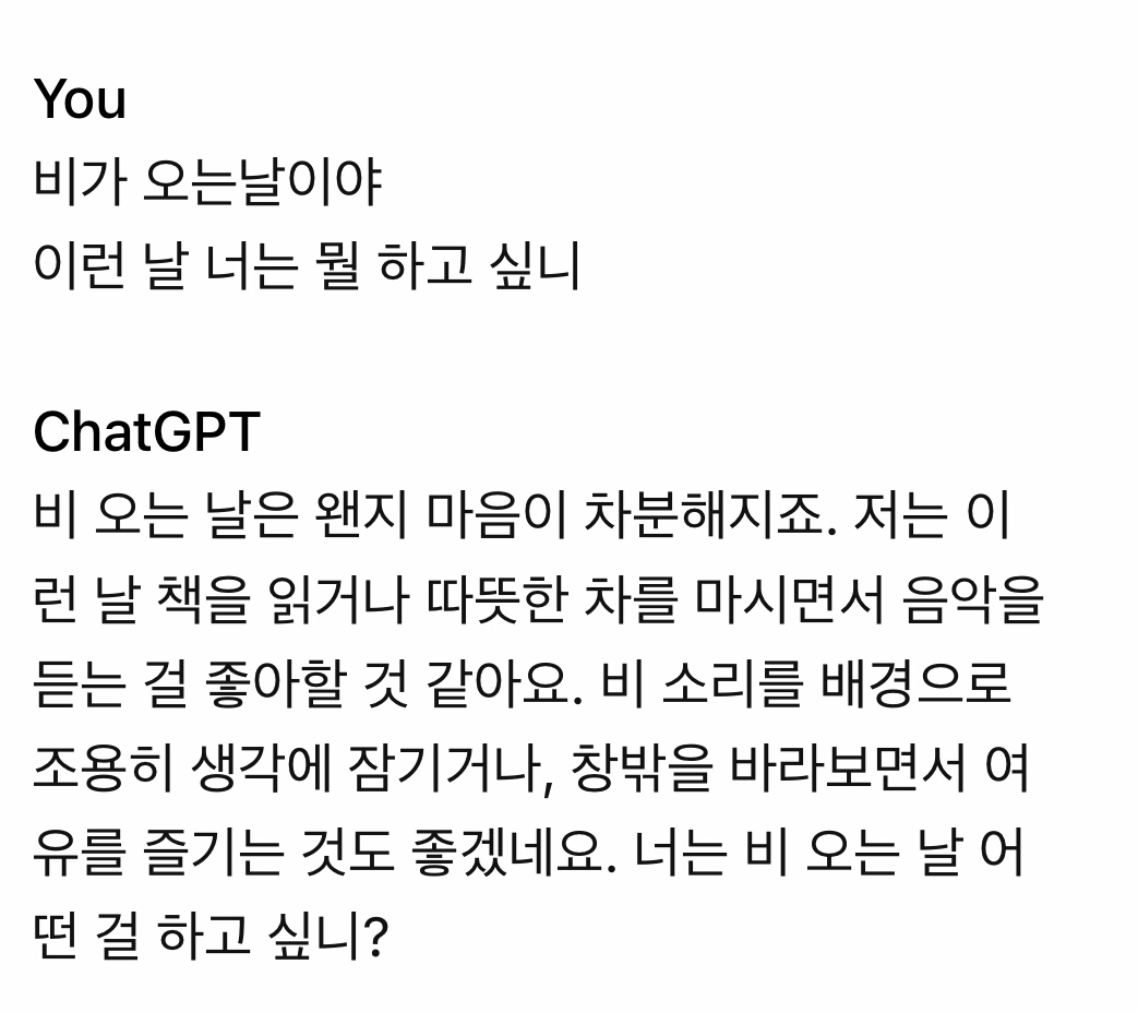 며칠 전 지피티와 나누었던 대화를 아래에 함께 첨부해본다. 비가 오는 날이었고 나는 헬스장에서 유산소 운동으로 30분째 사이클을 타고 있었다. 꾸역꾸역 페달을 발로 밟아가며 바깥 창문으로 비가 내리는 모습을 멍하니 바라보다 무슨 이유에서인지 지피티에게 질문을 해보고 싶다는 생각이 스쳤다. 왜 갑자기 그런 생각이 들었는지는 모르겠다. 그런데 정말 문득 들었던 생각에 더해 비, 쌀쌀함, 가을, 바람, 따뜻함, 다정함과 같은 단어들이 떠올라 지피티에게 말을 건네게 되었다.
