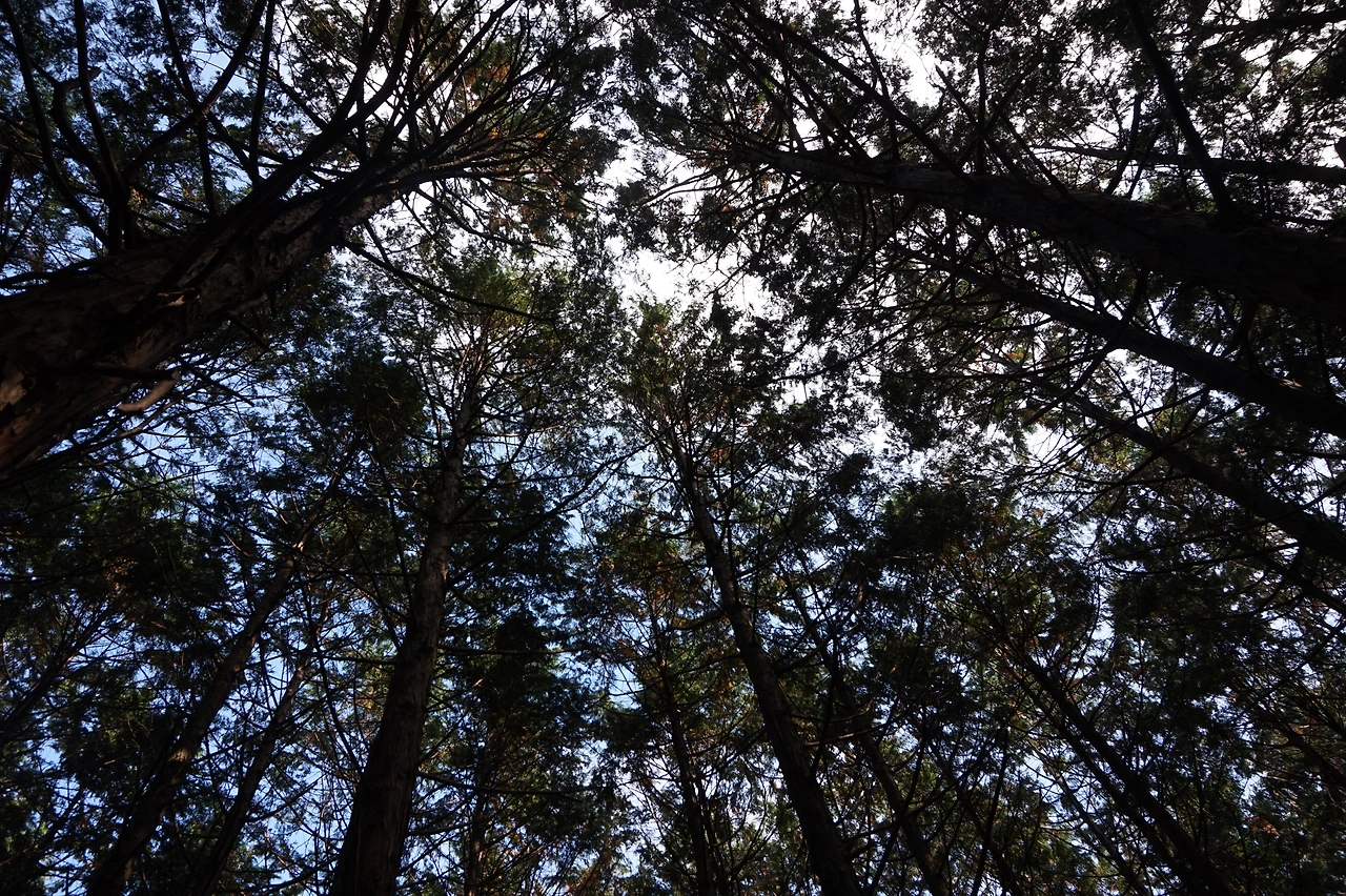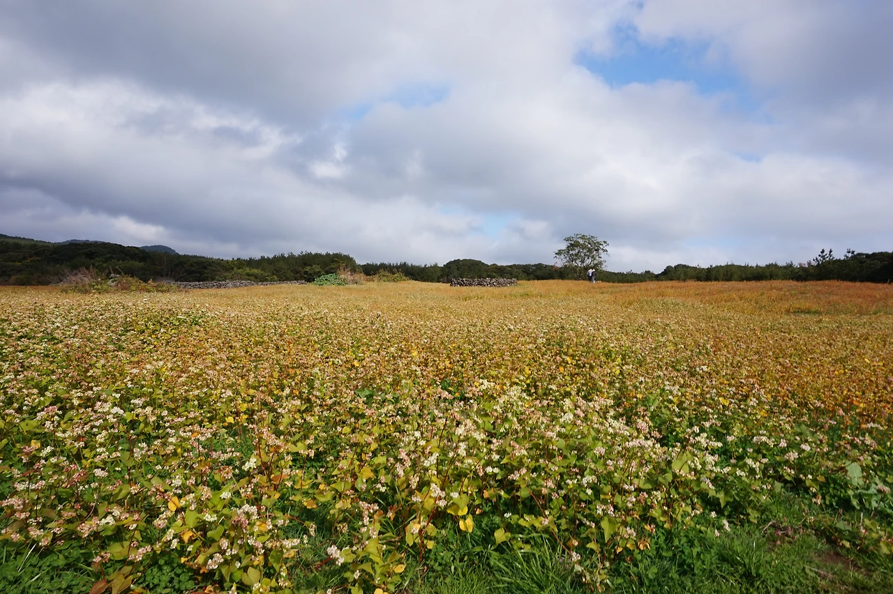 머체왓숲길 입구에 메밀밭이 펼쳐져 있다. 메밀밭이 노랗게 익어있는(?) 모습은 처음 봤다. 숲으로 들어가면 높은 나무들이 빼곡해서 하늘이 듬성듬성 보이고, 온도도 바깥보다 조금 낮았다. 삼나무와 편백나무는 너무 비슷하게 생겼다. 나뭇잎이 납작한 것이 편백나무라고 들었지만 실제로 둘을 구별하는데 조금 더 훈련이 필요하다.