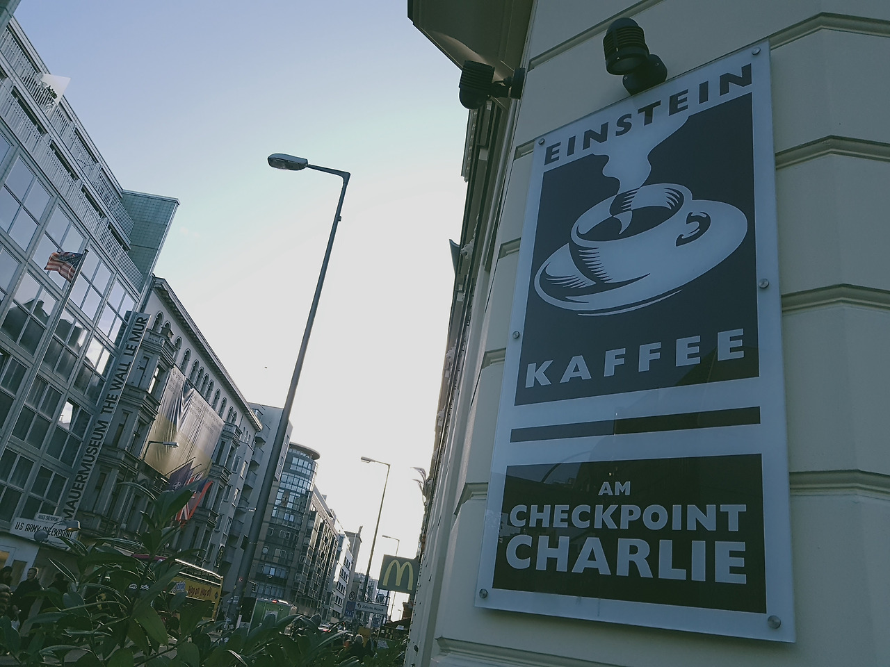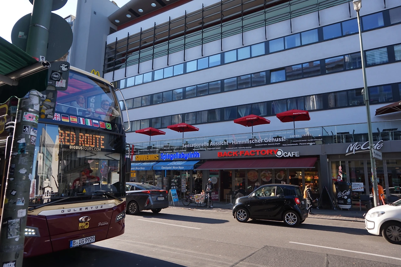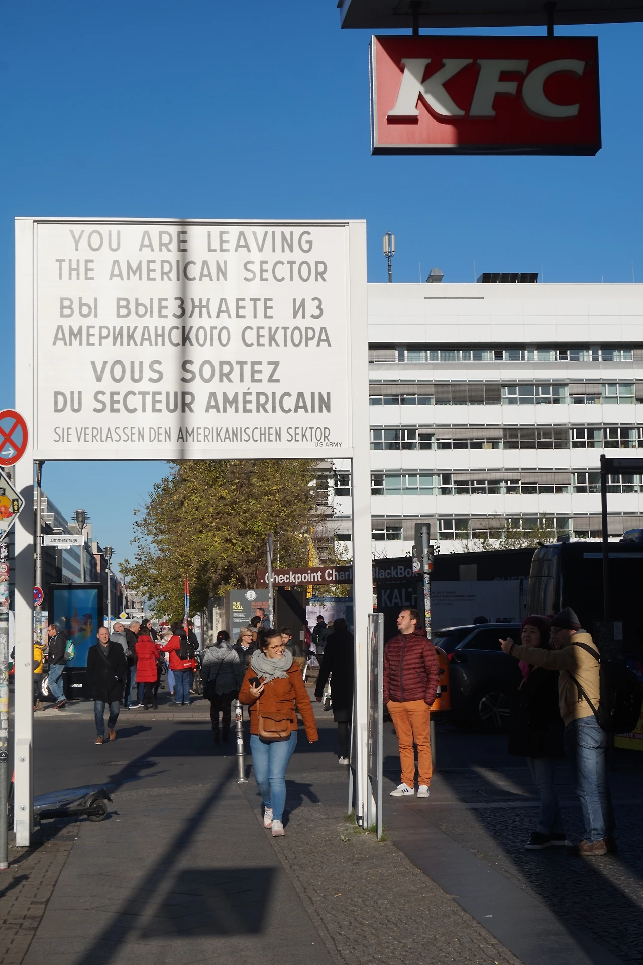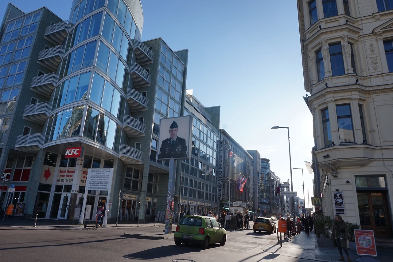 브란덴부르크문에서 체크포인트 찰리까지 걸어가는 길에 만난 거리는 군더더기 없이 네모 반듯했다. 건물들은 장식 없이 실용 기능에 무게를 두어 마치 임시 세트장 같았다. 냉전 시대를 배경으로 하는 스파이 영화에서 많이 봤던 풍경이었다. 체크포인트 찰리는 도로 한가운데 있고, 양 옆으로 상점가이다. 체크포인트 찰리가 없다면 이 거리는 과거가 없는 장소가 되어 버릴 것이다.