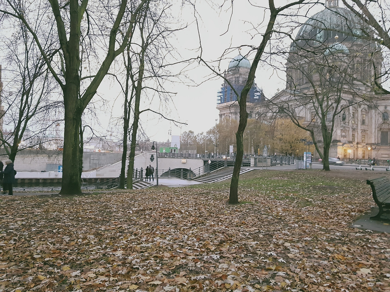 11월 베를린은 흐린 하늘과 축축한 공기 탓에 우수로 가득 차 있다. 우수어린 베를린을 본 건 행운이지만 햇살 좋은 계절, 베를린 영상을 보니 내가 본 베를린과는 전혀 다른 곳이었다. 한 도시에 잠시 머물고 그곳에 다녀왔다 혹은 그 도시를 안다고 과연 말할 수 있을까? 적어도 사계절을 다 봐야 안다고 할 수 있지 않을까? 11월 박물관섬은 아쉬움 그 자체였다. 관람시간도 안 맞고, 슈프레 강은 안개가 짙어서 외투 깃을 여미고, 고개를 숙이고 걷게했다. 아무것도 하고 싶지 않고, 무기력과 어깨동무를 했다. 돔만 내부만 다녀왔다. 박물관 섬은 베를린 구시가의 핵심인데 이 핵심을 겉에서만 보고 왔더니 콜라 없이 피자 먹은 기분이다. 그래도 풍경은 근사하다. 햇볕, 안개, 어스름, 바람이 들어간 거리는 내 최애 풍경.