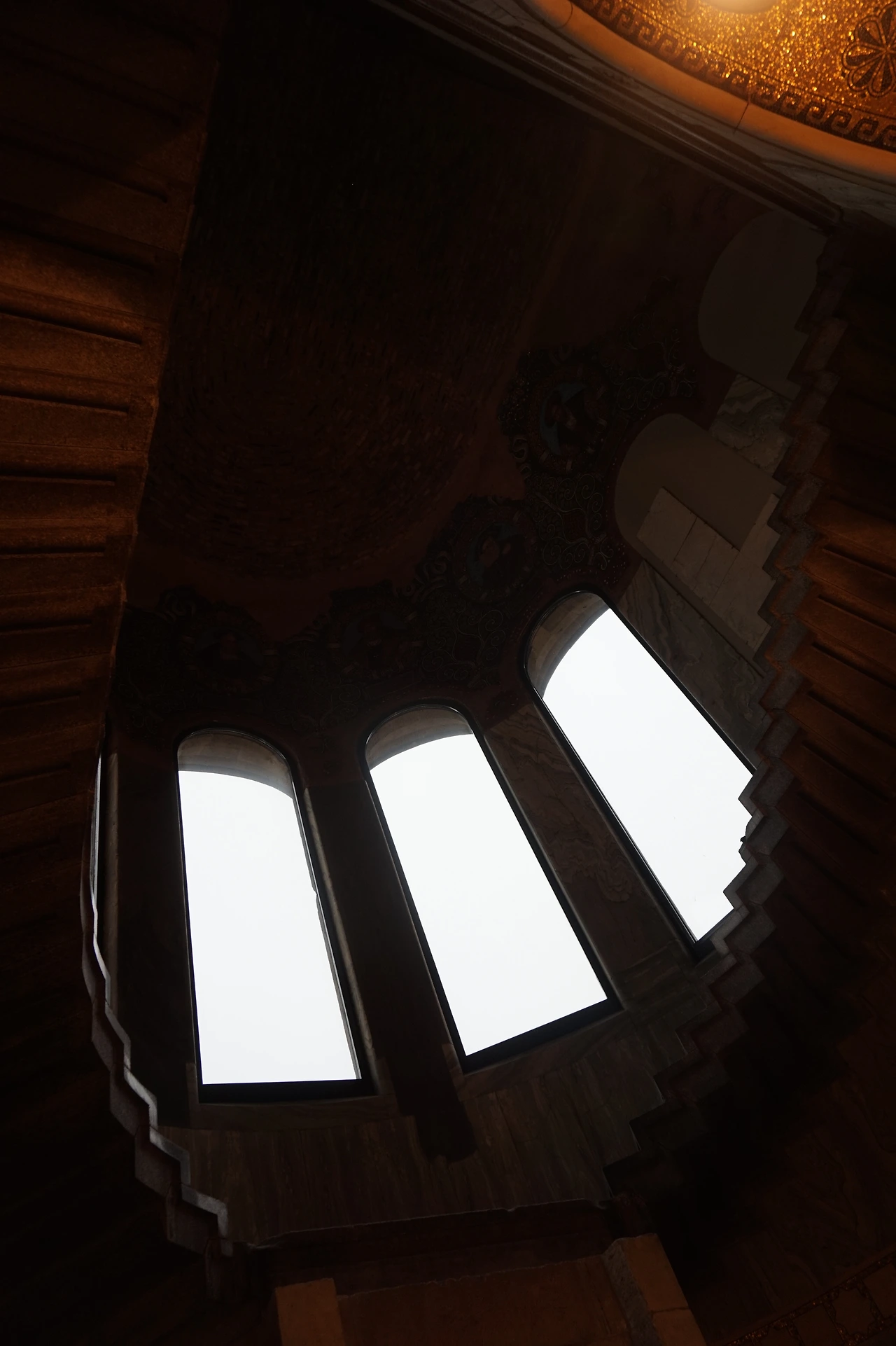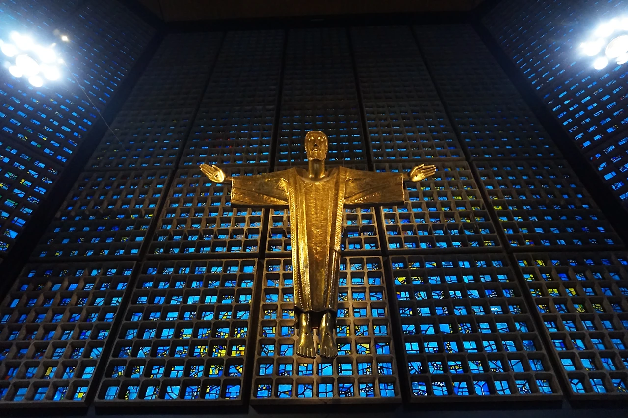 스테인드글라스 위에 작은 격자무니 창에 모던한 예수상과 제단. 현대적 블링블링함 속에 웅장함이 있어서 무척 인상적이었다.
