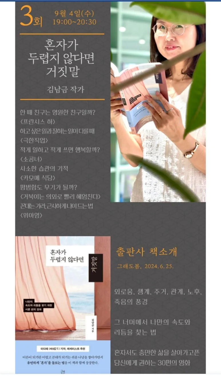 저는 세 번째 순서입니다. 제가 요즘 하고 있는 북토크 주제, 영화로 나를 돌보는 법으로 이야기를 풀어나갈 예정입니다. 이 책은 '혼자'란 말이 들어있어서 나는 혼자가 아니야, 생각하시면 곤란합니다^^
