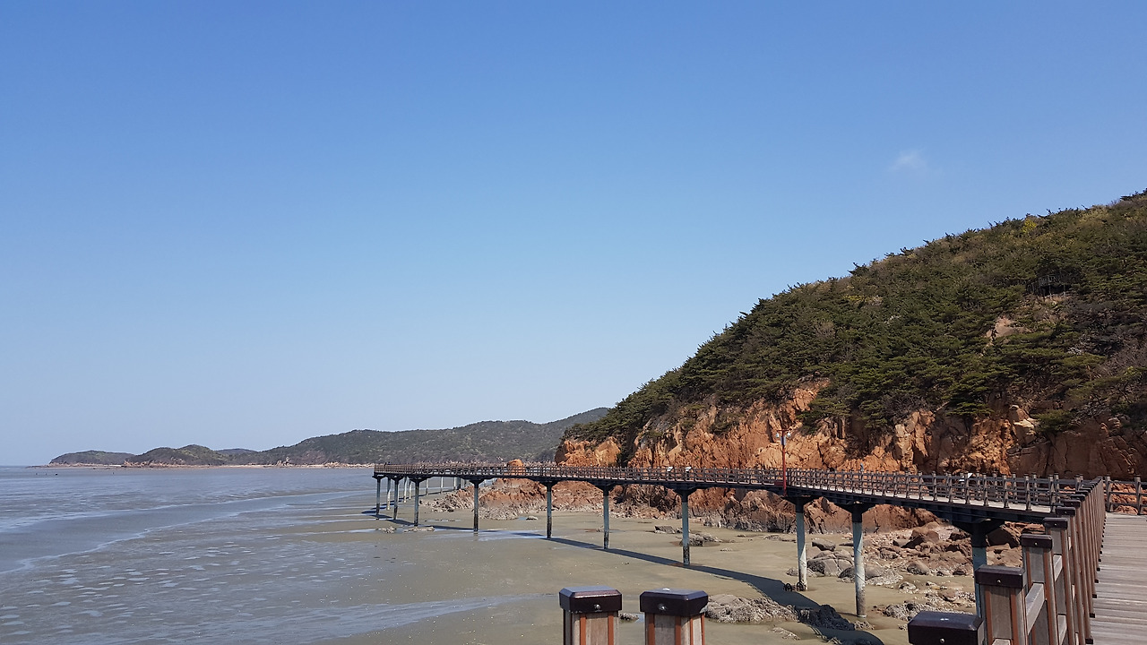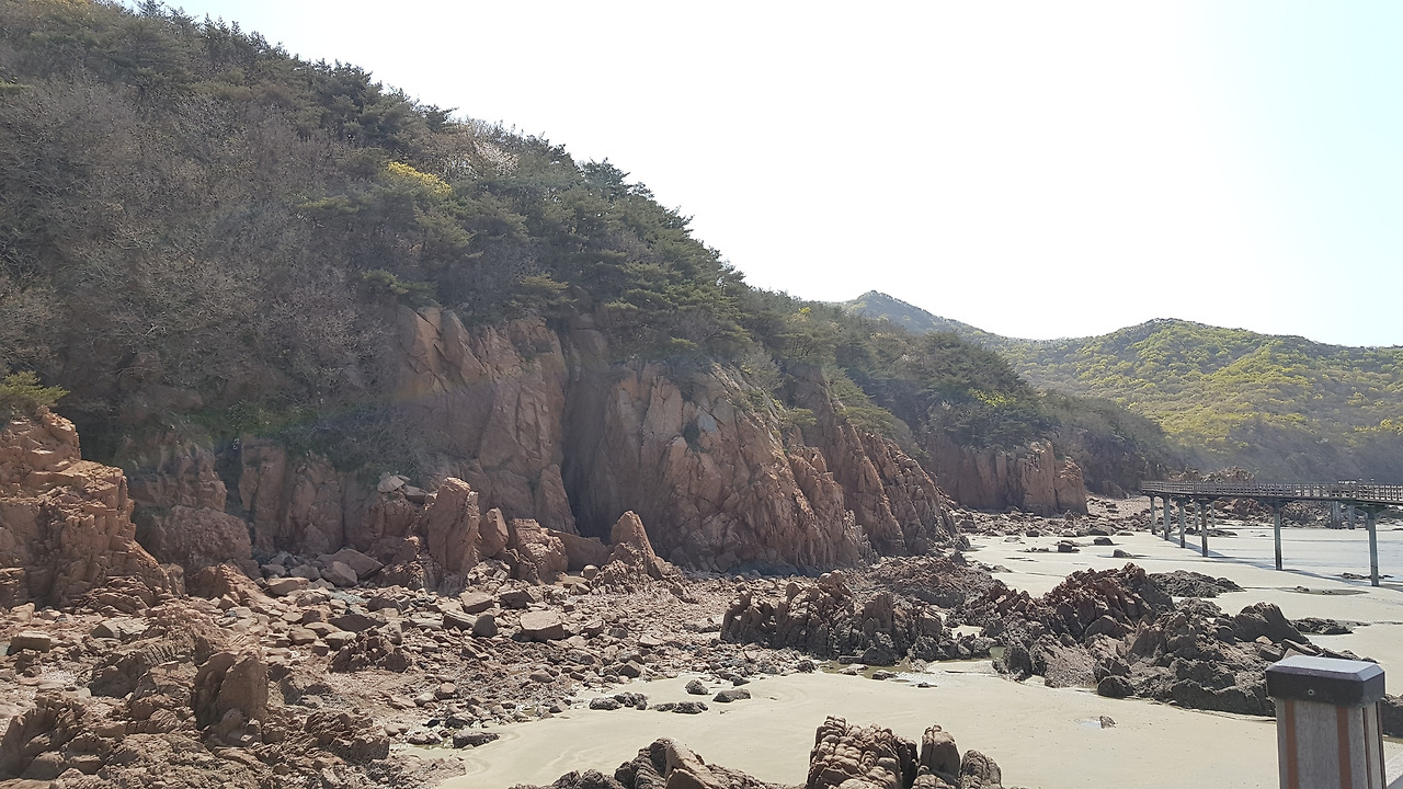 바람의 비위를 맞추며 걷다 보면 바위의 모습을 온전히 볼 수 있다. 반대편에는 물 빠진 넓은 모래 바닥이 펼쳐져 있었다. 이 다리는 처음 보면 무의도 바다 풍경을 망치고 있다고 생각하게 된다. 하지만 다리 위를 걷다 보면 왜 이 흉한 다리를 만들었는지 깨닫고 조금 감사하게 된다. 비록 지금은 물이 없어도 작은 물웅덩이가 남아 바다라는 흔적이 곳곳에 드러난다. 길게 이어진 다리 위에서 바람과 걸으며 주변 풍경이 눈에 들어온다. 바다 위를 걷고 있는 느낌이 와락 다가온다. 물 때가 되면 말 그대로 바다 위를 걷는 느낌일 것 같다. 자연을 알뜰하고 편하게 즐기려는 지극히 인간의 관점에서 만들어져서 이기심이 엿보이지만 다리 위를 걸으면서 좋아서 다리 건설에 감사하고픈 양가적 감정을 갖게 된다.