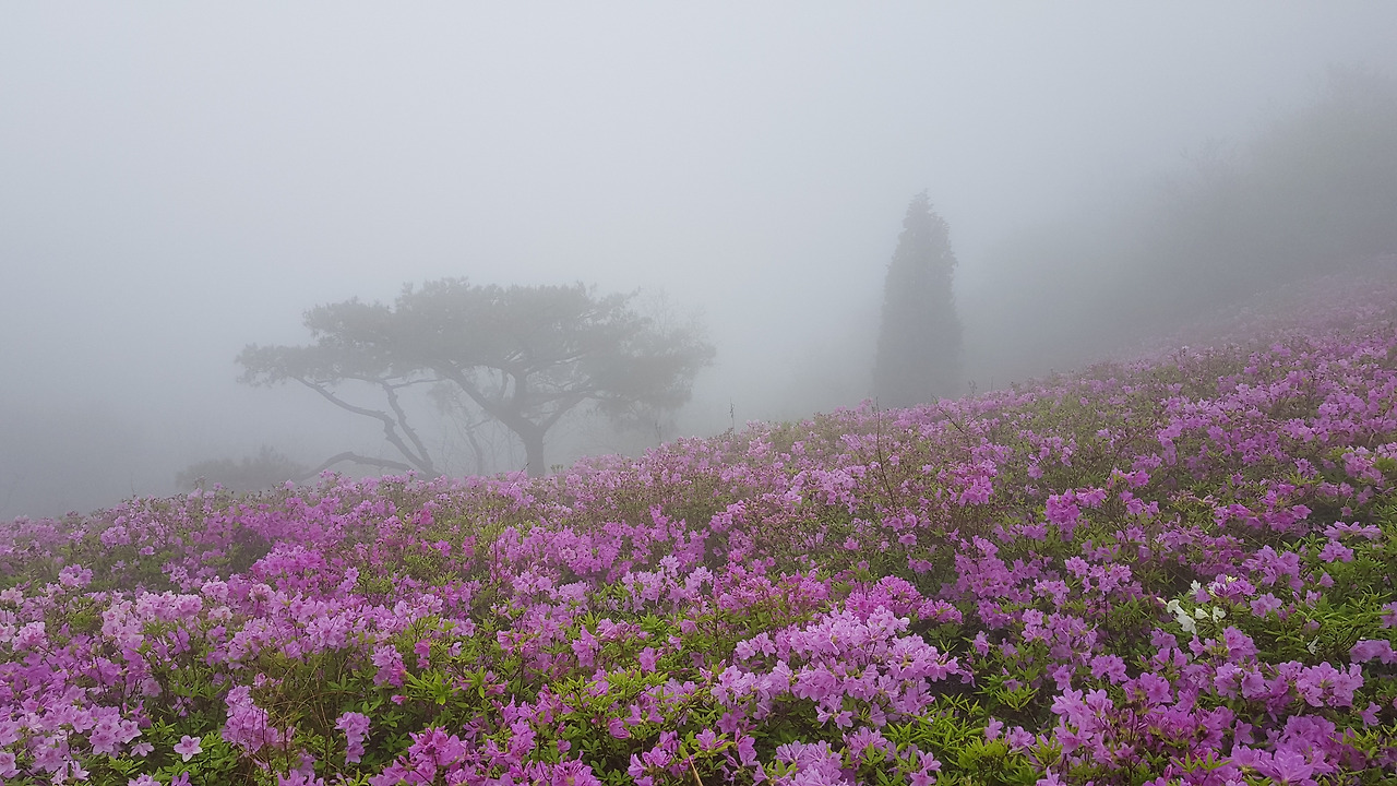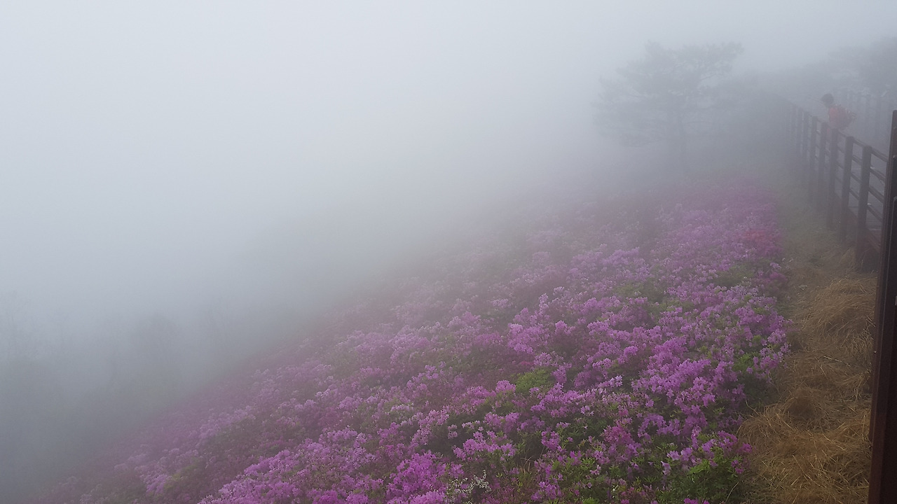 진달래 군락지를 지나면 철쭉 군락지가 나온다. 안갯속에 꽃담요가 비스듬하게 깔려있는 것 같다.