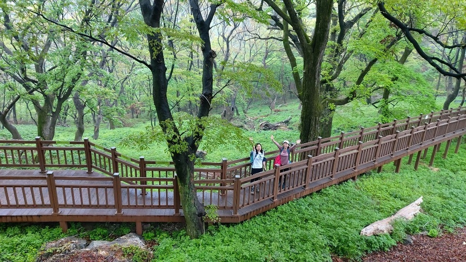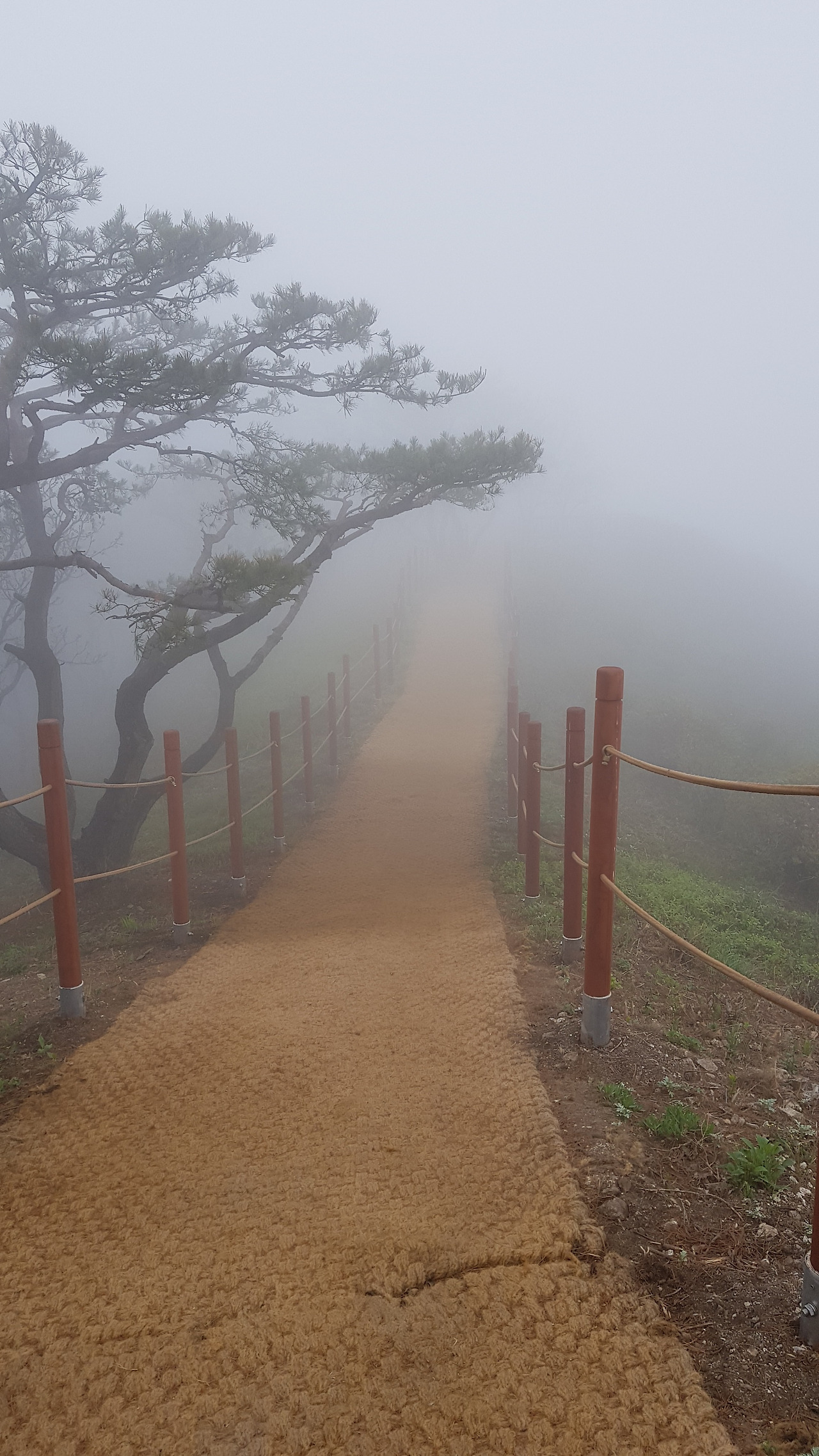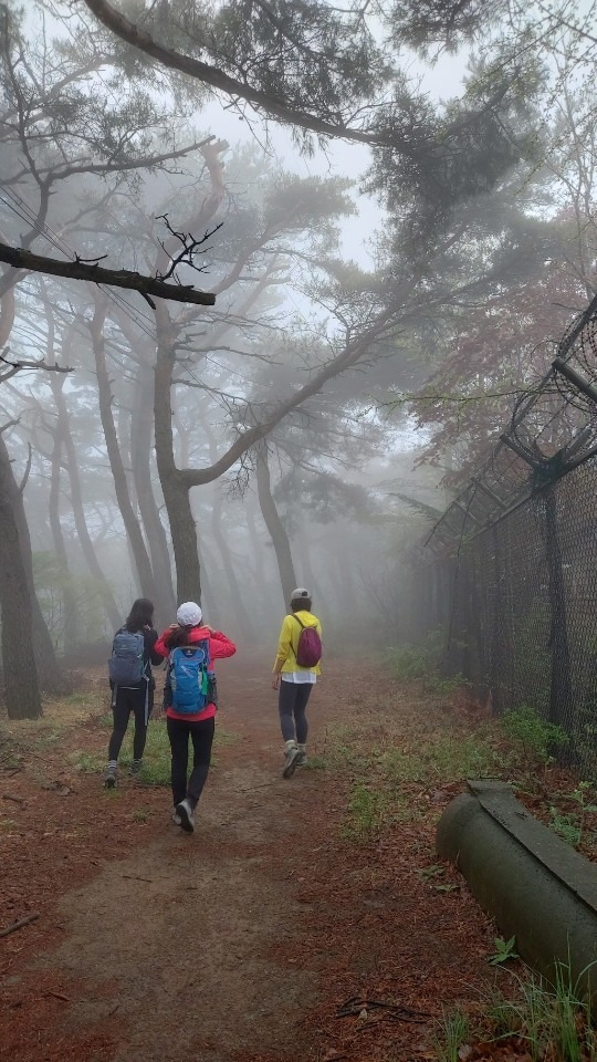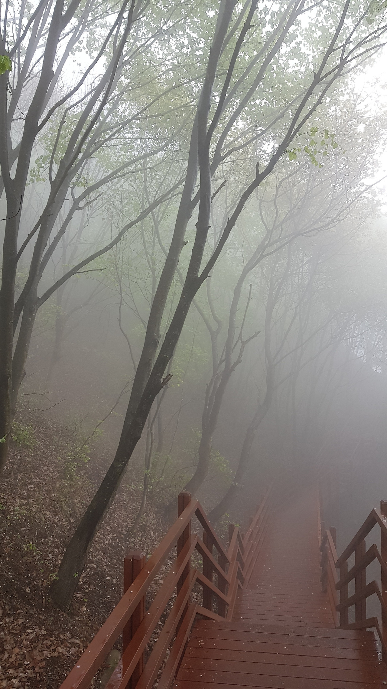 안갯속에 앉아서 가져간 간식과 알밤 막걸리를 한 잔 마시고 걷기 시작했다. 어릴 때 야외에서 술판(?)을 벌이는 사람들을 이해 못했다. 나이 들면서 야외에서 마시는 맥주나 막걸리 한 잔은 꿀맛이어서 사수해야 하는 흥이 되어버렸다.어쩔. 고려산 정상을 향해 난 길은 데크길로 잘 정비되어 슬리퍼 신고도 걸을 수 있을 정도다. 데크길 따라 쭈욱 걸으면서 안갯속에 포옥 안겼다. 는개가 조금씩 뿌리고 있었지만 걷기를 방해기 보다는 오히려 안개를 짙게 만들어 문명의 세계에서 나와 수묵화의 세계로 들어온 것 같은 착각을 불러일으켰다.