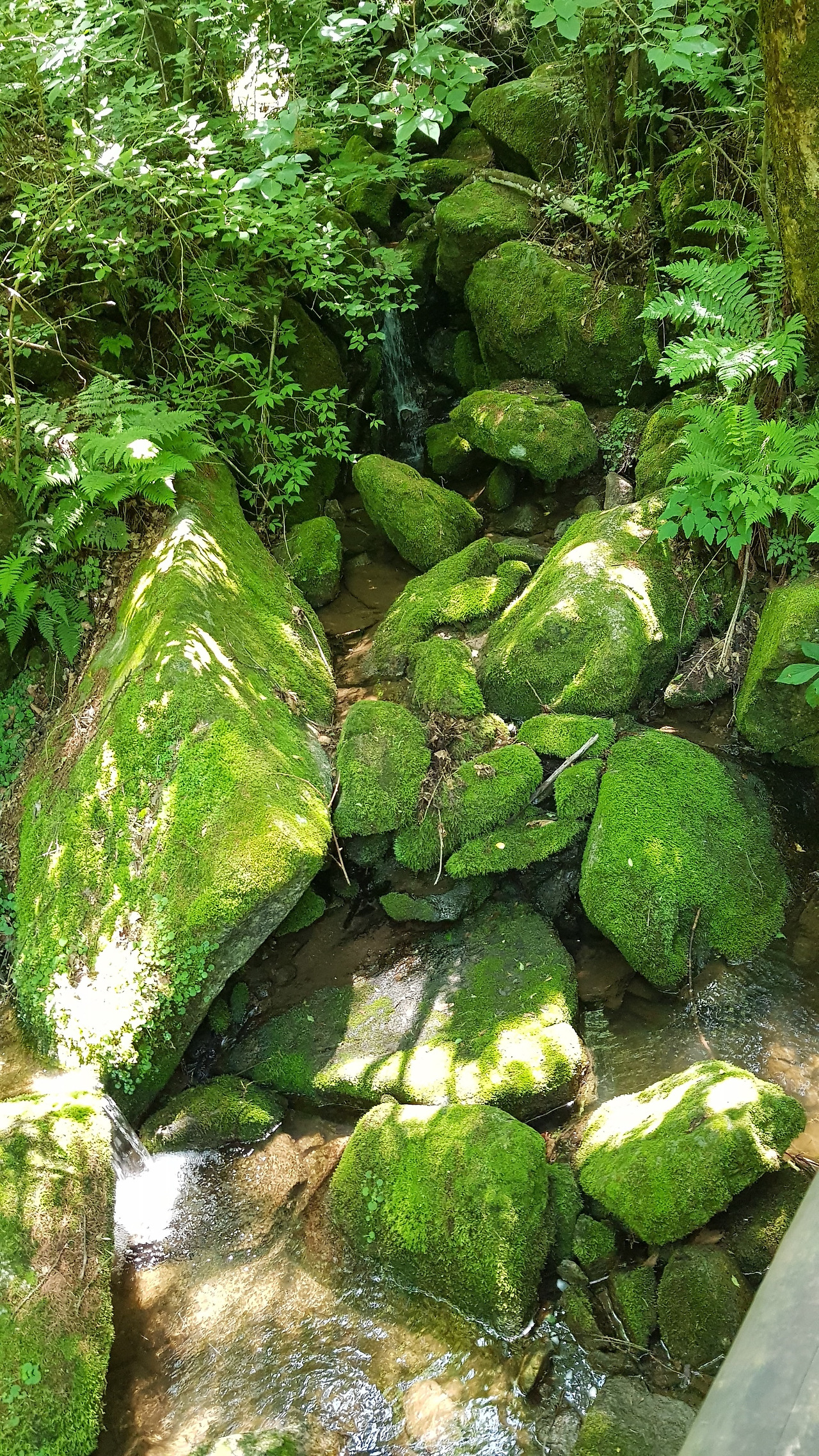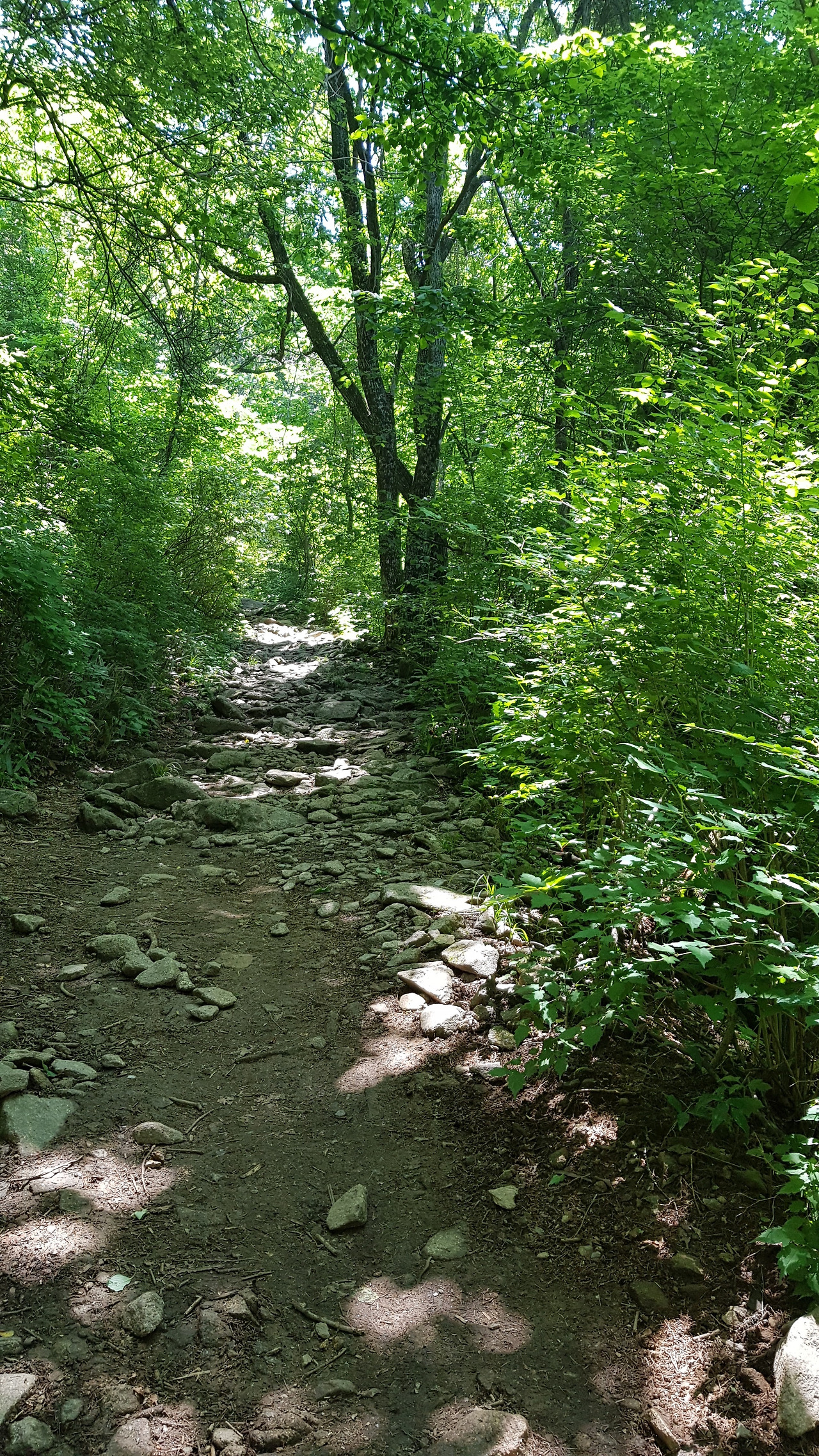올라가는 길 왼쪽 계곡에는 바위에 이끼가 살고 있다. 겨울에는 벌거벗은 나무들 아래에서 햇빛을 독차지 하지만 여름이면 나뭇잎들이 만든 파라솔 아래 앉아있다. 등산로에 돌들이 보이지만 흙산이라 험하지 않다. 우거진 나뭇잎들이 그늘 지붕을 만들어서 내내 오솔길을 걷게 된다. 겨울에 봤던 모습과는 180도 변신한 모습이다. 소백산, 너~어 매력의 끝은 어디인 거니?