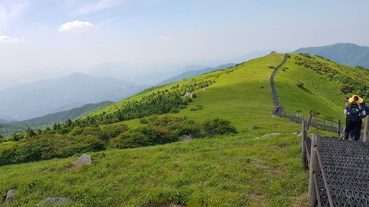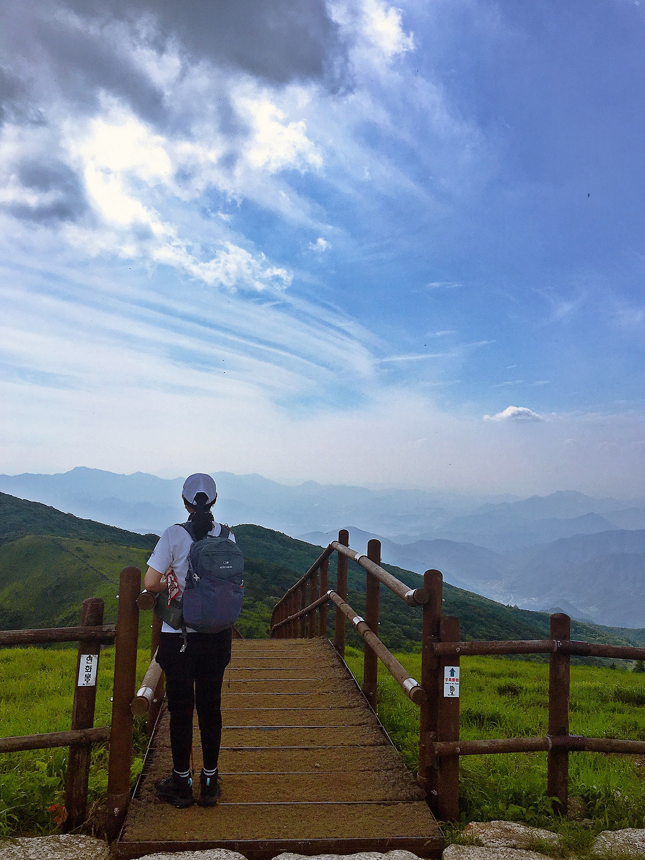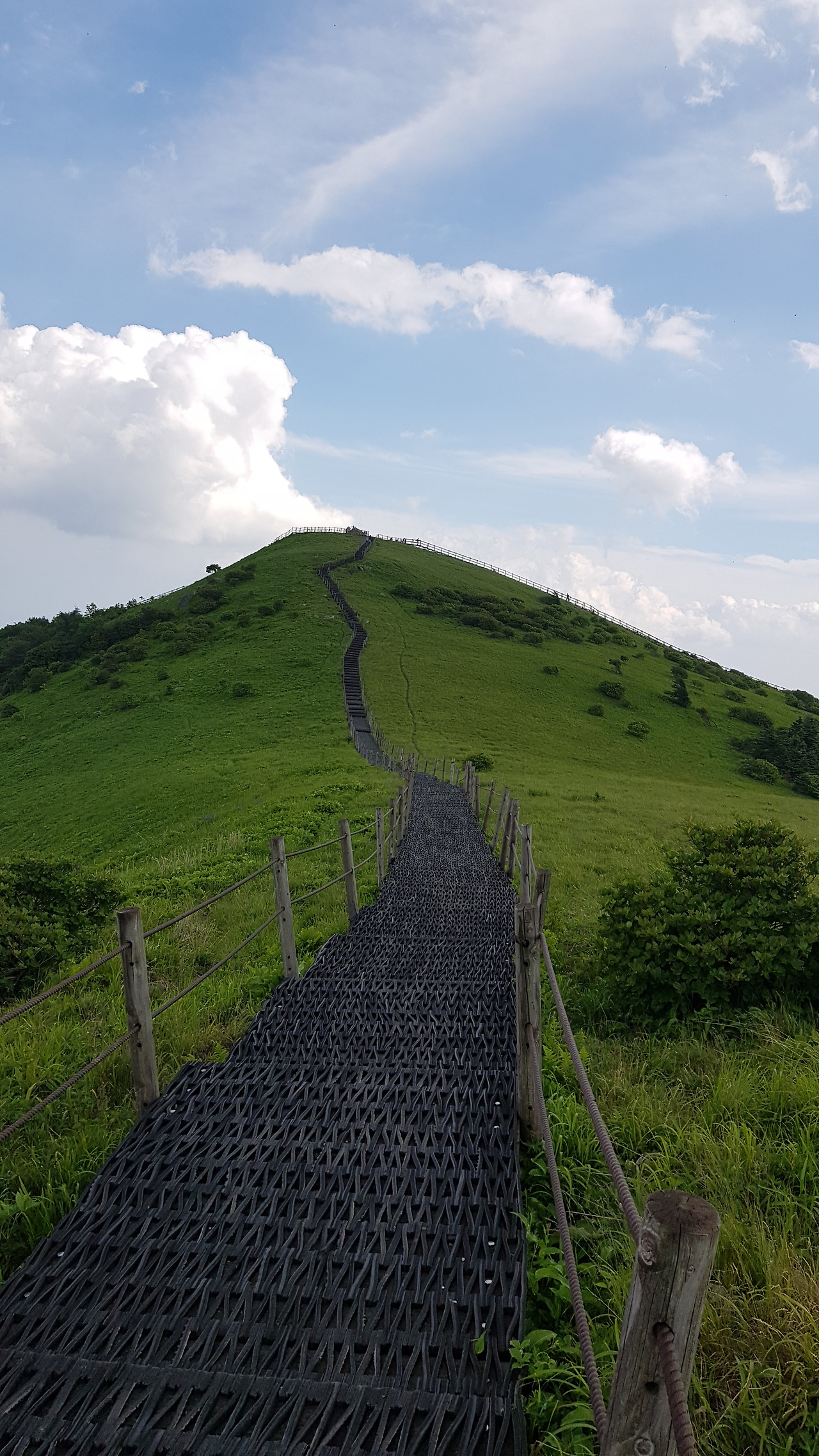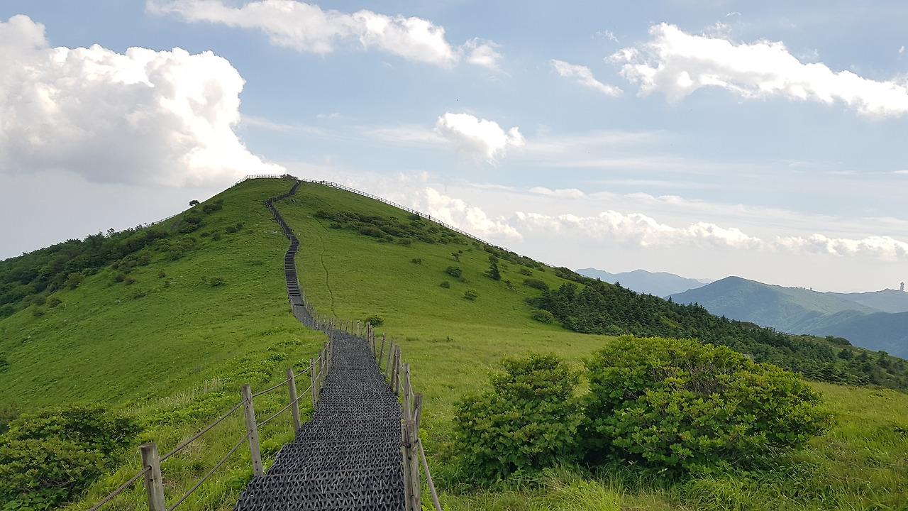 구름을 이고 있는 탁 트인 초록 능선을 바라보면 솟구치는 도파민. 이럴 때면 나는 전생에 방목되던 소나 양이 아니었을까 생각하곤 한다. 눈 앞에 있는 아름다움을 놓칠까 봐 조바심이 나서 360도 몸을 돌려 사방을 스캔을 한다. 이리 보고 저리 보아도 어여쁘다. 뭉게구름 아래에 싱그러운 초록들로 혼탁한 시선과 정신이 맑아진다.