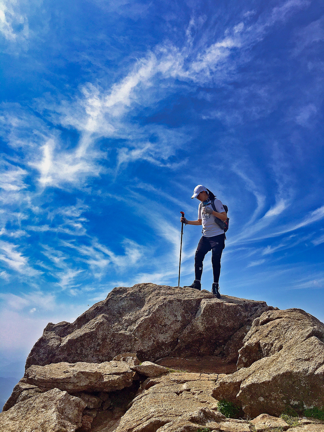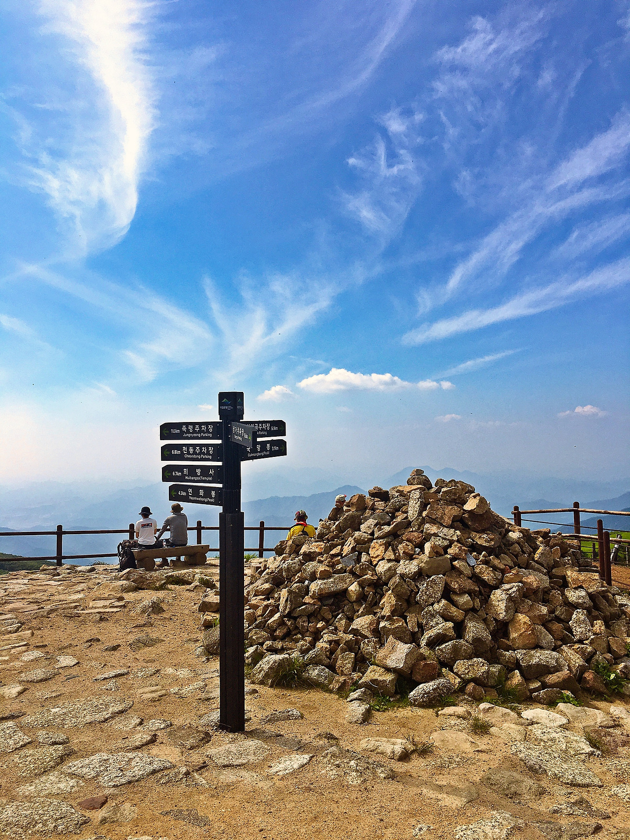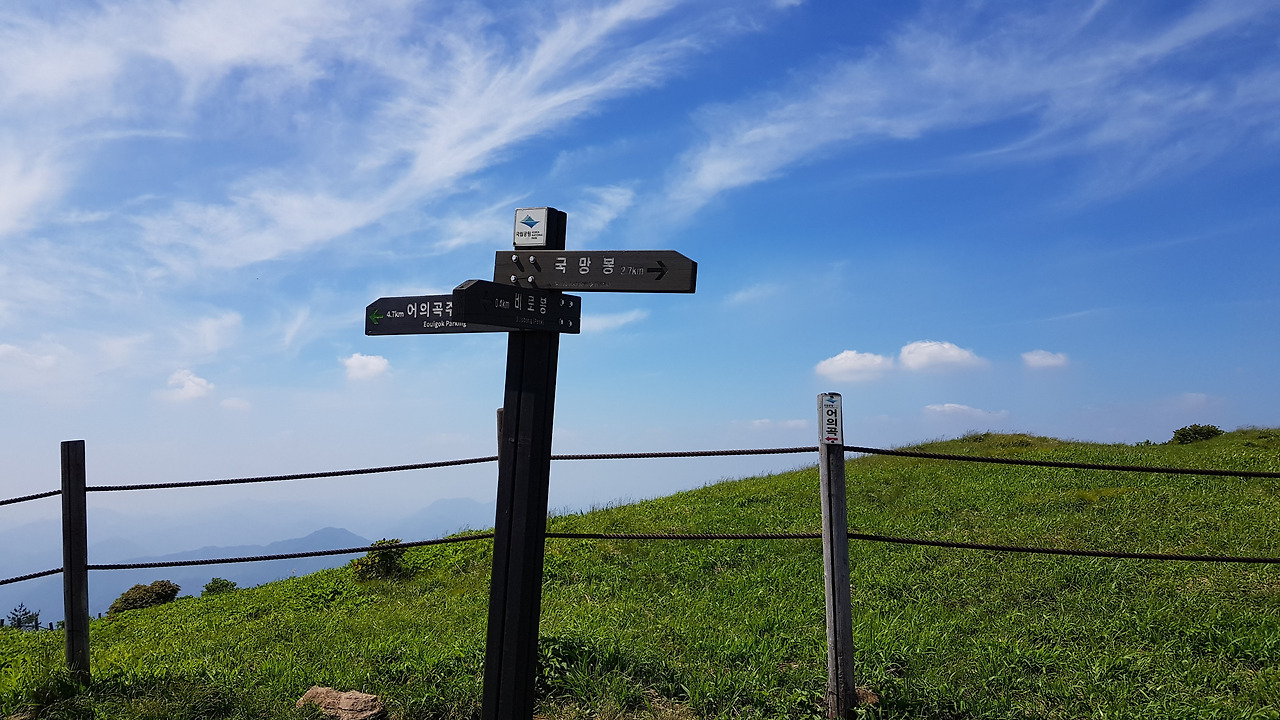 어의곡, 국망봉, 비로봉으로 길이 나누어지는 어의곡 삼거리에 도착한다. 어딜 봐도 파랗고 푸르구나. 삼거리 이정표 옆에 바위가 있다. 그리 높지 않은 바위인데 고소공포증이 있는 내게 바위와 친해지라고 손 잡아 올려준 친구 덕분에 인증숏을 찍었다. 왜 때문에 등산객들은 바위만 보면 본능적으로 올라가는 걸까. 나는 바위 포비아가 있어서 늘 구경꾼이었는데 듬직한 친구들이 손을 잡아줘서 포비아를 조금씩 극복하는 중이다. 하지만 위에 올라가면 다리를 꼿꼿하게 펼 수 없어서 엉거주춤 서서 구경거리가 되어버리는 비애.