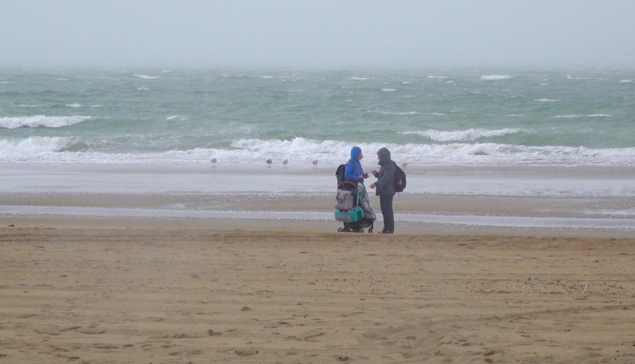 영화가 끝날 무렵, 두 사람은 덩케르크의 바다에 갔다. 비가 내려서 두 사람 다 비옷을 입고 비옷에 달린 모자를 눌러썼다. 남편은 비 오는데 왜 바다에 가서 촬영을 하는지 모르겠다고 투덜거린다. 기차 안에서 그들은 서로 얼굴을 돌리고 있다. 기차에서 내려 두 사람은 경직된 표정으로 유모차를 끌고 바닷가 모래사장에 이르렀다. 유모차 바퀴는 모래에 빠져서 앞으로 나가지 못했다. 바람은 세차게 불고, 멀리서 커다란 파도가 부서졌다. 두 사람이 각자 떨어져서 가다가 한 사람이 유모차 앞을 들고, 한 사람이 유모차 뒤를 들고 모래사장을 걸었다. 비바람은 계속 불었다. 두 사람은 잠시 유모차를 내려놓고 각자 우산을 폈다. 우산은 바람의 힘을 못 견디고 반복해서 뒤집어졌다. 두 사람은 뒤집어진 우산을 바로 잡으려고 애썼다.