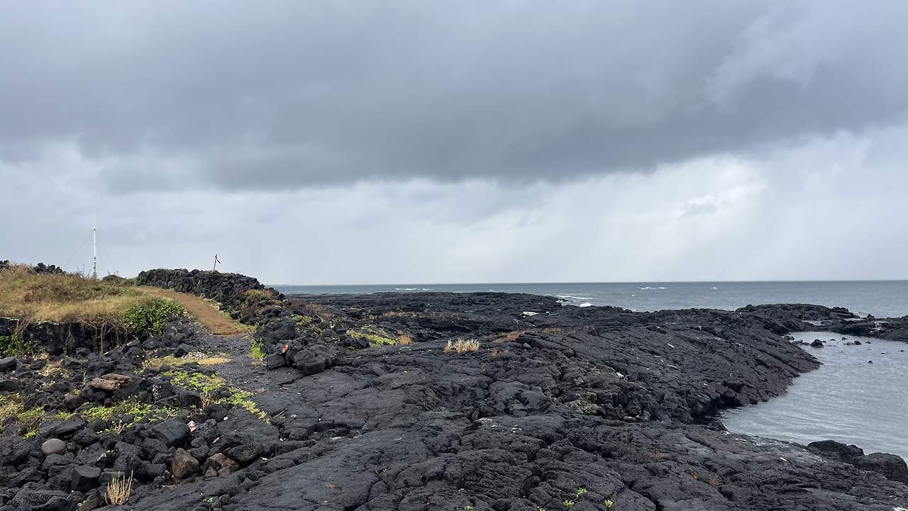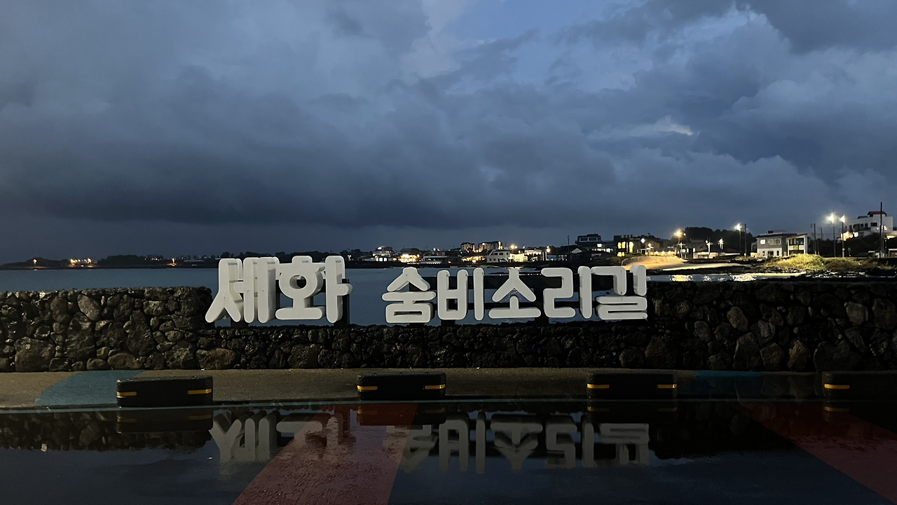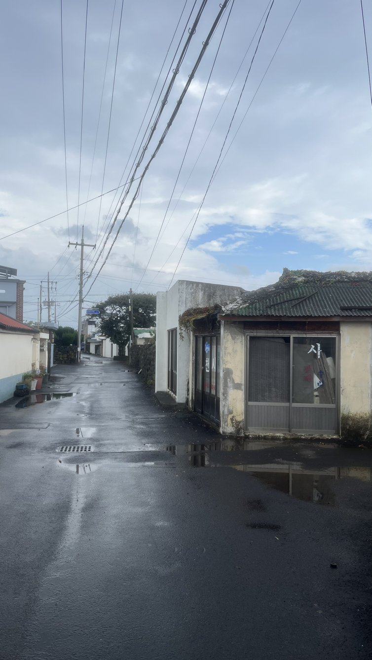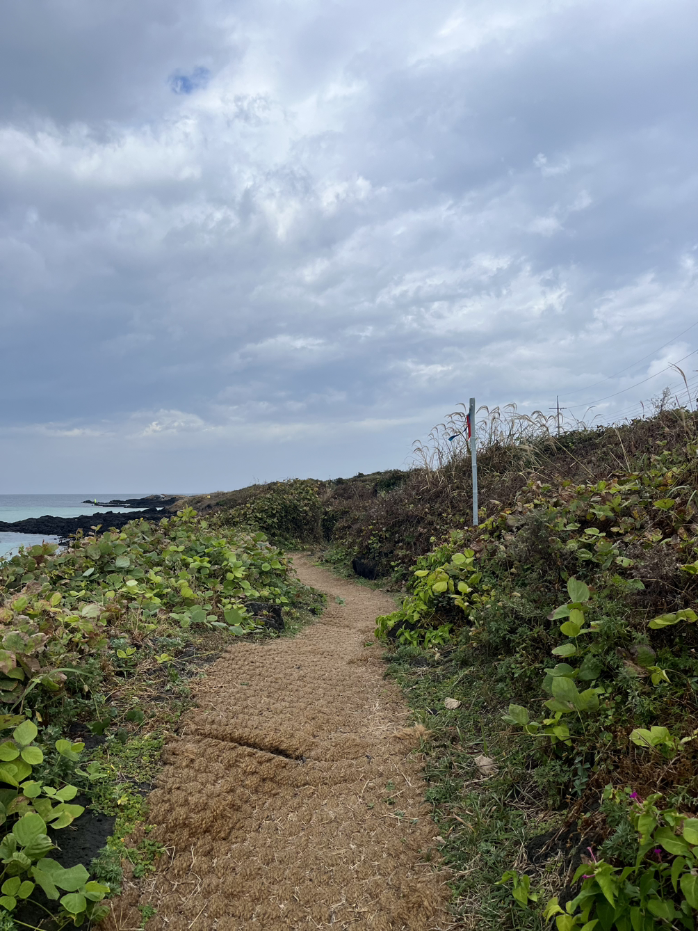 희로애락의 하루는 김녕리에서 시작되었다. 제주 시내를 걷다 와서 그런지 김녕해변은 유달리 아름다웠다. 구름뒤에 가려진 태양이 잠깐이라도 인사해 주기를 기다리며 검푸른 바다를 보고 있자니 여행 4일 만에 진짜로 엽서 속 제주도에 온 것 같았다. 바다와 나만이 있는 동네에서 혼자서 20분 동안 사진 찍고 감탄하고 난리가 났다. (아직 못 가본 올레 동쪽 코스가 벌써부터 기대된다!) 하늘에는 부드러운 뭉게구름 조각이 성난 적란운의 소리에 못 이겨 떠밀려가고 있었다. 분명 몇 시간 안으로 억새비가 내릴 조짐이었다. (어제 구름이 태양을 이긴 것에 감명받고 구름 공부 좀했다. 적란운이란~) 지레 겁을 먹고 오늘은 카페에서 바다멍이나 할까 고민했지만, 그래도 이런 날씨 덕분에 올레꾼은커녕 길가에 사람은 나밖에 없었기에 오늘 하루는 비와 나의 데이트라 생각하기로 했다. ‘오늘 아니면 언제 또 내가 비 오는 날 일부러 걷겠어~’ 긍정 마인드 장착 완료.