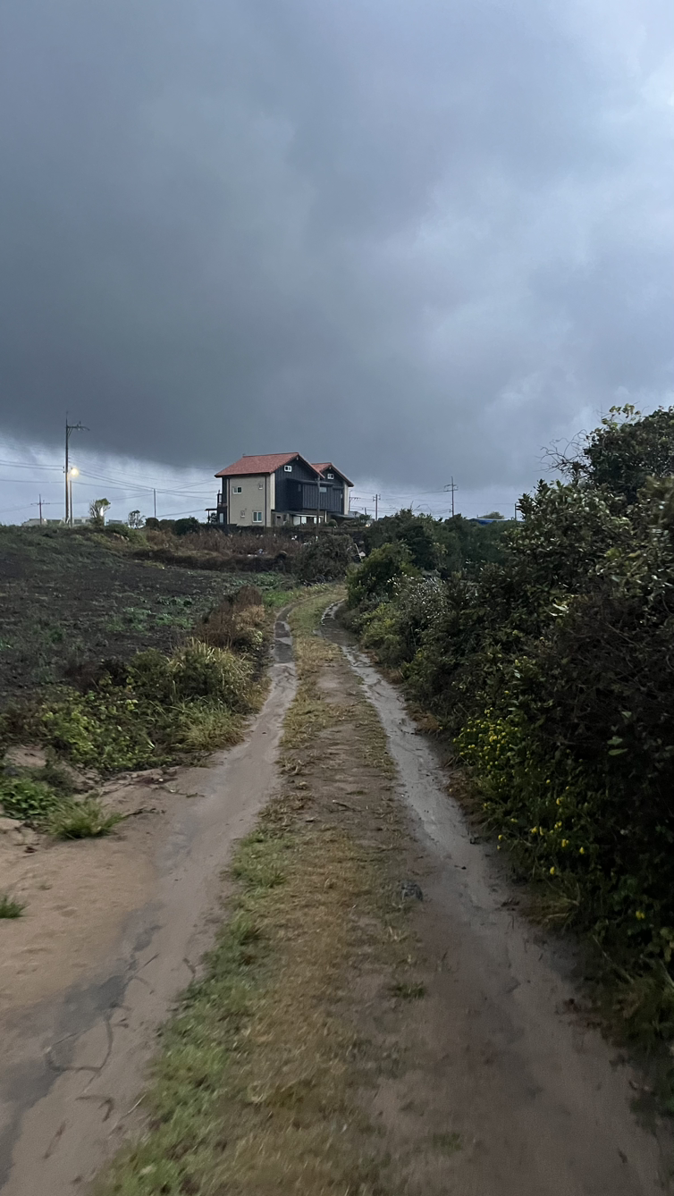 하지만 내 마음은 제주도 날씨처럼 빠르게 변했다. 우산에 가려져 주변 풍경이 아닌 땅만 보며 걷고 있자니 고새 비에게 투덜대고 있었다. 비가 그쳐 우산을 접으면 다시 빗방울이 떨어지고, 참다못해 우산을 피면 다시 빗방울이 멈추고. 자꾸 약 올리는 먹구름은 땅 위에서 묵묵히 걷고 있는 나를 보며 눈물이 날 정도로 웃고 있는 듯해 더더욱 얄미웠다. 진흙에 미끄러지지 않게 조심조심 걷다 보니 점점 시간이 빠듯해졌다. 아직 중간 지점도 오지 못한 터라 얼른 걸음을 재촉했다. 그런데 걸으면 걸을수록 더 불안해졌다. 평온은커녕 즐겁지가 않았다. 하늘도 어두웠고, 내 마음도 어두웠다. 이거야 말로 며칠 전 길가에 할머니가 얘기하신 ‘내돈내고,’ 내 돈 내고 내가 고생이었다.
