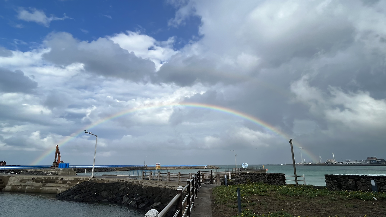 말을 천천히 하며 걸으니 마음도 평온해지고, 타이밍도 맞아 뜻밖의 선물도 받았다. 월정리 해변을 지나는데 아주 잠깐 비가 멈추다 못해 햇살이 빼꼼했다. 무지개와 함께! 잠깐이지만 미웠던 비에게 사랑을 느끼는 순간이었다.
