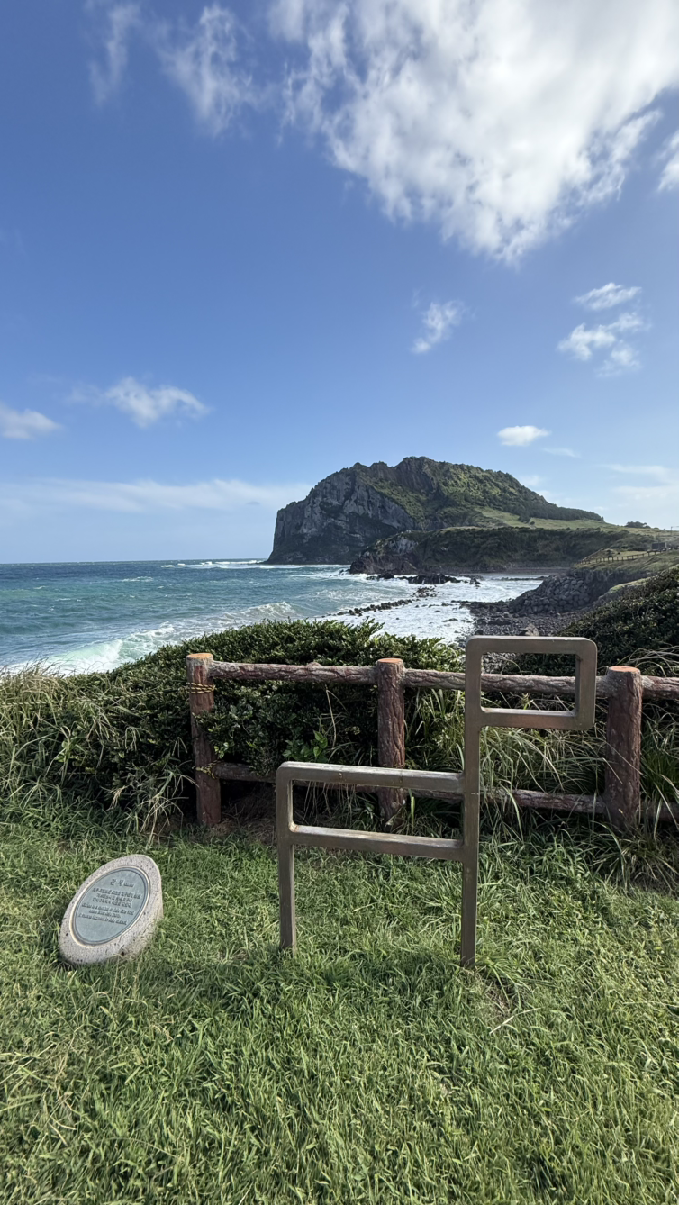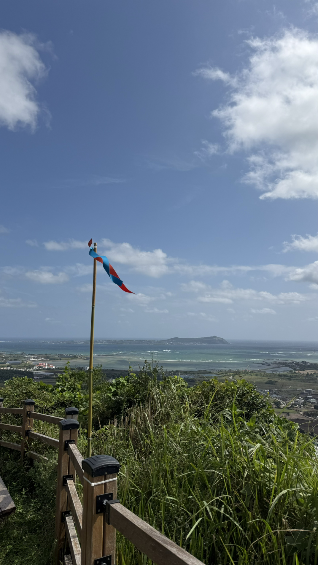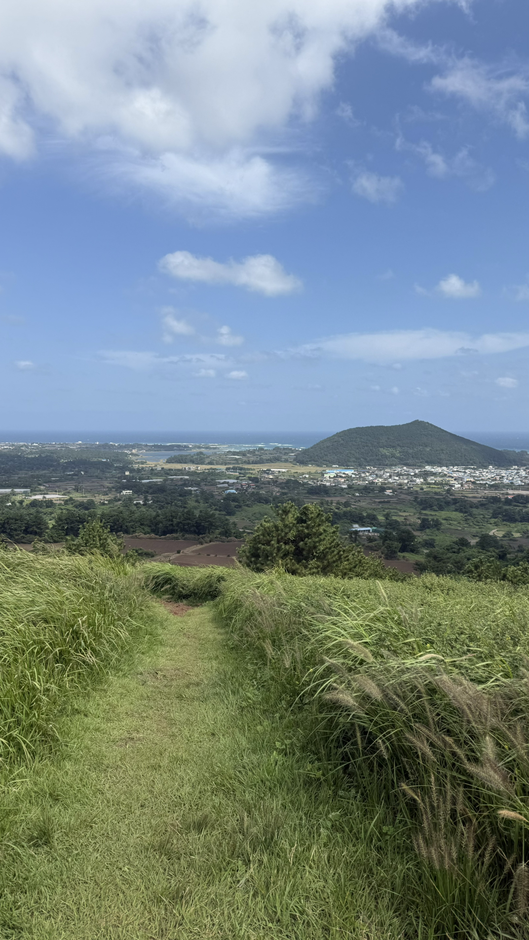아직 첫 번째 오름이지만 어제와는 비교가 안 될 정도로 좋았다. 새와 바람소리만 들리는 길은 정말이지 너무 고용하고 평화로웠다. 얼마 전 새로 산 핸드폰으로 자신 있게 사진과 영상을 막 찍어대는데 ‘내추럴 라이트’ 모드는 내추럴이 아니었다. 그 어떤 신기술도 진짜 자연의 색감은 낼 수 없나 보다. 대신 두 눈에 말미오름 정상에서의 성산일출봉과 우도를 꽉꽉 담아냈다. 누구 하나 보채지 않고, 나만의 페이스대로 즐길 수 있는 이 시간이 행복했다.