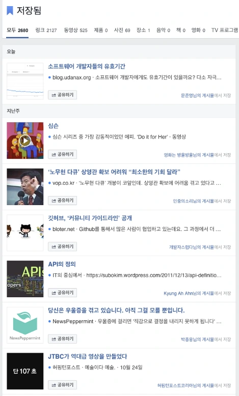 저의 페이스북 '저장' 란을 열어보니 2,700여 개의 링크가 저장되어 있었습니다. 뉴스피드를 보면서 나름대로 중요하거나 다시 읽어볼 만하다고 생각되는 것들을 저장해둔 것입니다. 기술적인 내용도 있고, 시사적인 것도 있고, 간간히 귀여운 동물이나 웃긴 영상도 있습니다. 그러나 대부분은 한 번만 읽고 저장만 해두거나, 읽지도 않은 채 잊혔습니다.