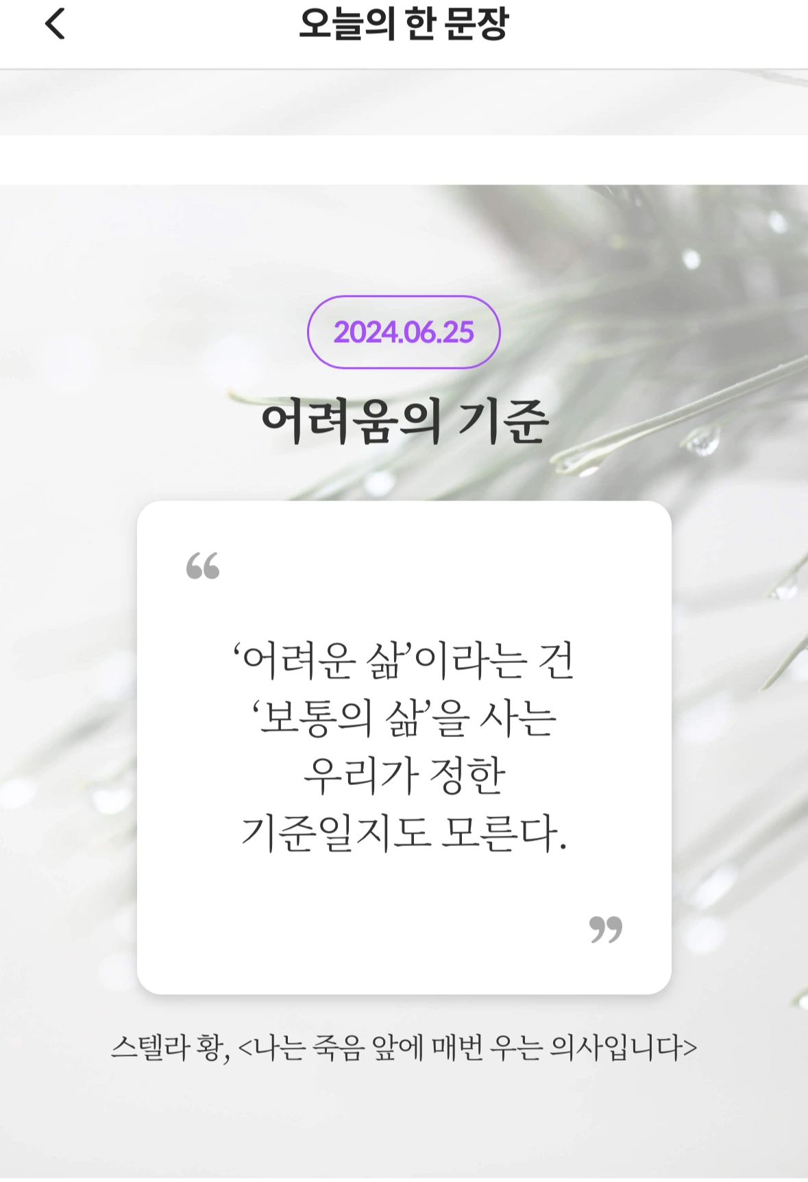 마지막으로 내게 크나큰 의미가 있는 이 문장을 오늘의 한 문장으로 소개해주신 밀리의 서재 에디터께 감사를 드린다. 책 마무리 과정에서 일어난 개인적인 일로 두 꼭지를 더 쓰고 수정을 많이 했다. 몇 주동안이나 내게 큰 화두였던 삶의 질. 내 마음을 알아주신 한 분이 계셔서, 수많은 문장 중 내게 가장 의미 있는 말을 꼽아주셔서 진심으로 감사하다.