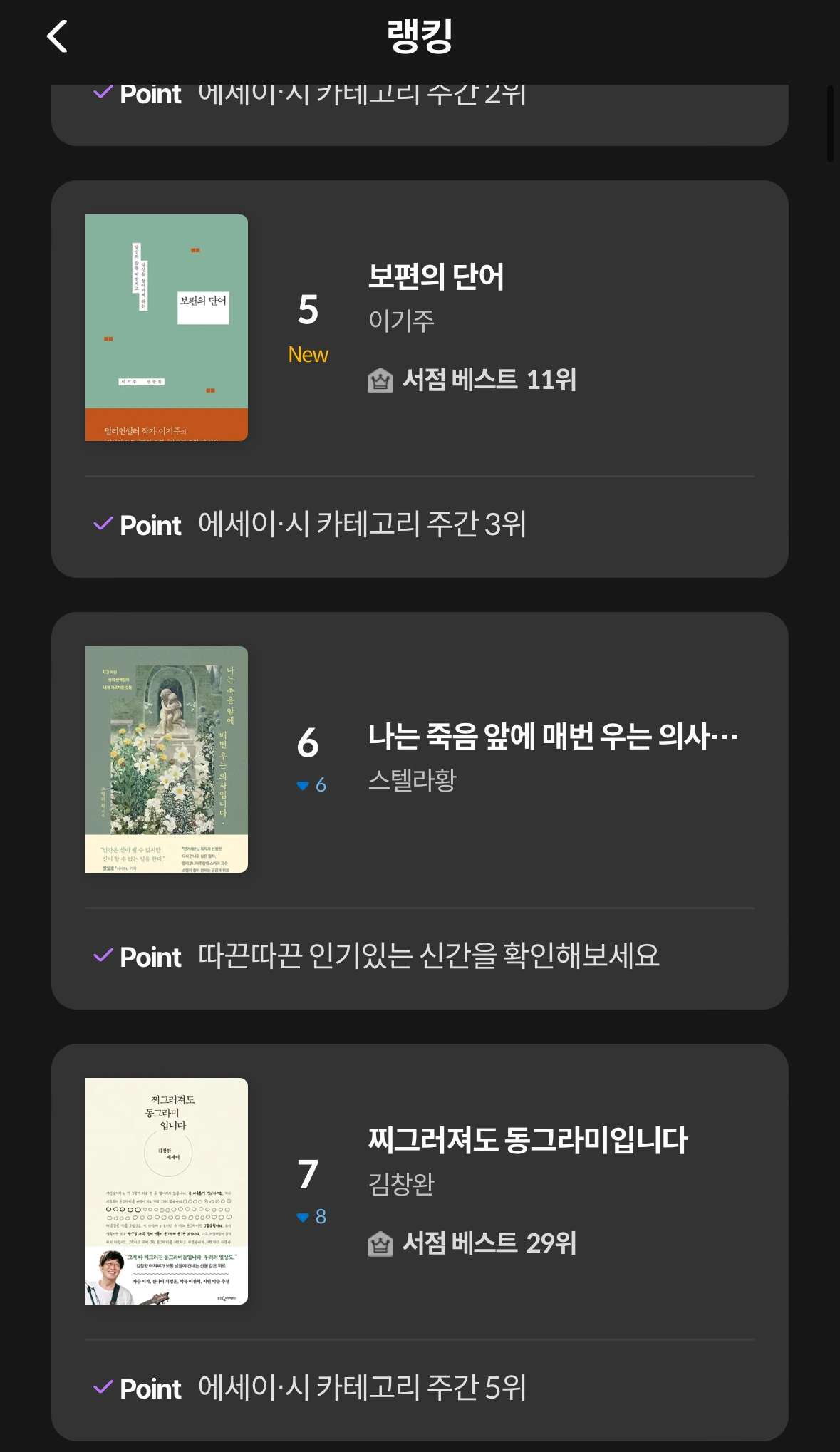 첫 책이 나온 뒤, 감사하게도 오늘의 문장, 신간 소개, 이번 주 주목할 신간에 소개해 주셨다. 그래서 에세이 인기도서에도 여러 번 올라 내게 큰 기쁨을 주었다. 내가 좋아하고 매일 자주 쓰는 앱에서 내 책이 메인이 뜨고 특히나 좋아하는 에세이 카테고리 제일 위, 또 제일 앞에 뜨는 일은 정말 신나는 일이다!