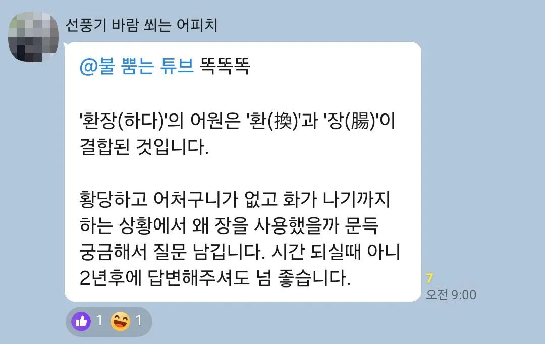 감정이 격해지면 우리 몸에서 가장 강한 자극을 받는 곳이 소화기관입니다. 창자의 순우리 말이 '애'인데 애끓다, 애타다, 애쓰다와 같은 단어들의 어원이 거기 있다고 봅니다.
