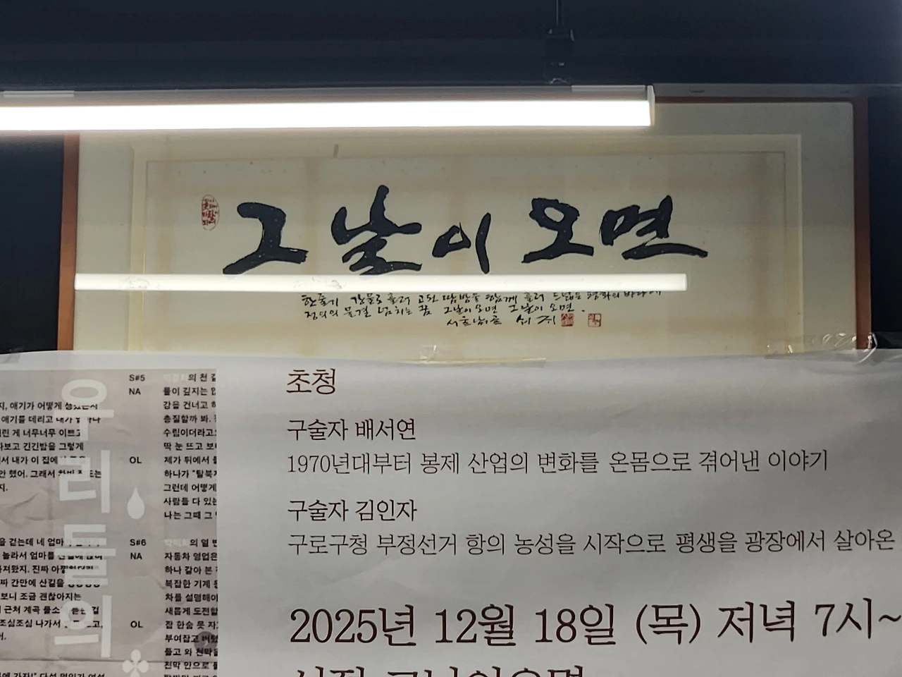 김인자 선생님과 배서연 선생님의 이야기는 이 공간의 역사와 정확히 겹쳤다. 가난하고 밀려나고 그러나 끝내 사라지지 않았던 삶들. 우리는 어느 한 날, 한 시에 함께 있었다. 그 삶을 ‘이야기해도 되는 것’으로, ‘들어야 할 이야기’로 만들었다. 지금 이 시대에 이런 서점이 남아 있다는 것, 그리고 그 서점에서 여전히 사람들의 삶이 말해지고 있다는 사실은 엄청난 일이다. 《우리들의 드라마》 북토크는 이 서점이 왜 사라지지 않았는지를, 그리고 왜 앞으로도 필요할 수밖에 없는지를 조용히 증명한 밤이었다.
