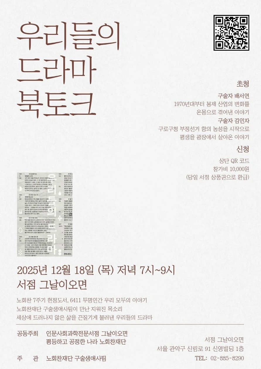 이날의 북토크는 노회찬재단과 그날이 오면 서점이 함께 주최한 자리였다. 구술생애사 기록집 《우리들의 드라마》 속 주인공인 김인자 선생님과 배서연 선생님의 삶을 직접 듣는 시간이었다. 이야기를 들으며 계속 같은 질문이 맴돌았다. 우리는 왜 누군가의 이야기를 들어야 할까. 왜 굳이 이렇게 시간을 들여 마음을 써야 할까. 나는 늘 이 질문 앞에서 마음이 불편해진다.