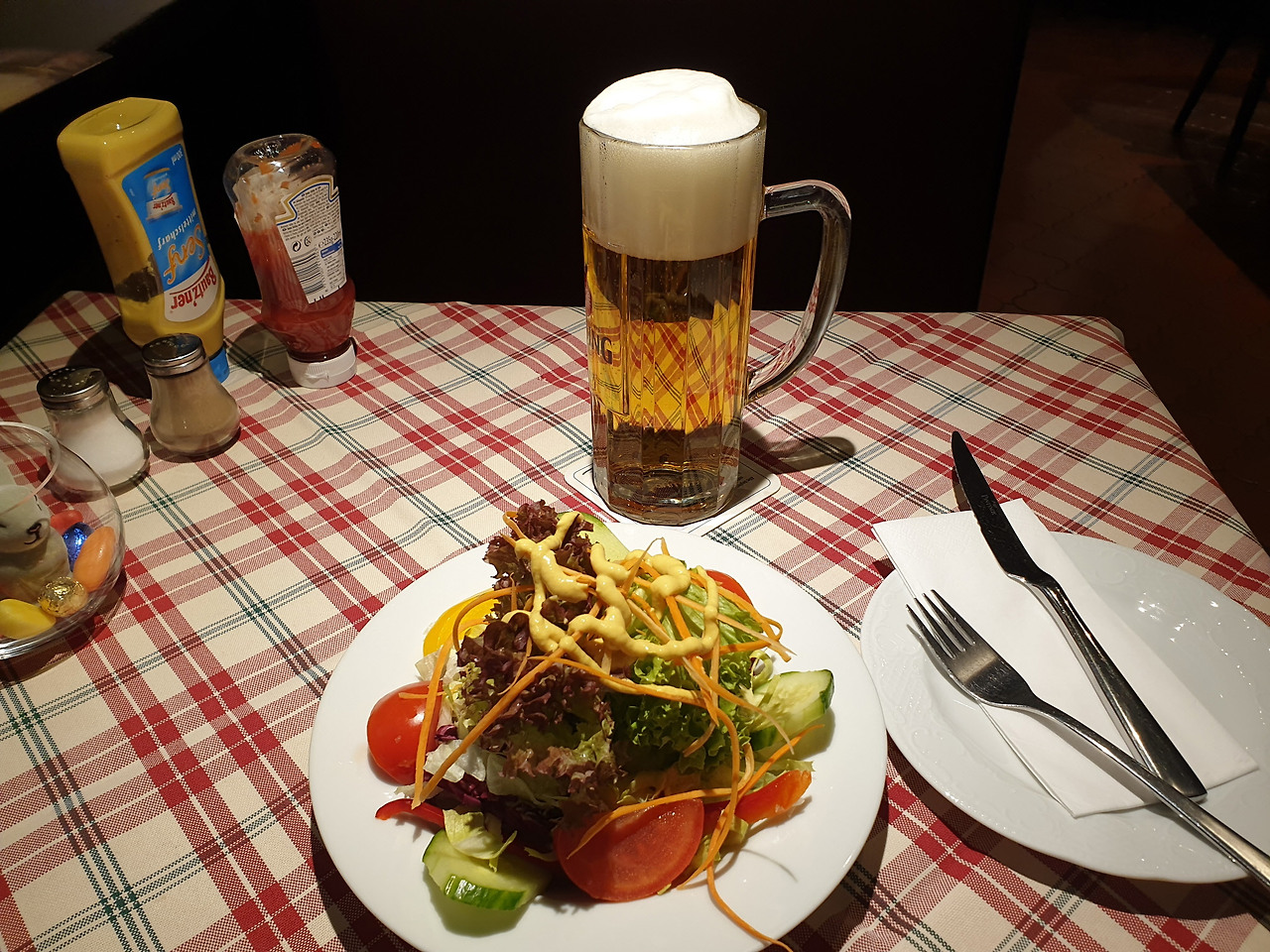 목표한 식당에 도착했을 무렵 괜찮은 평점에 비해 다행히도 대기 손님이 있거나 하진 않았다. 곧바로 가게 구석의 창가 자리에 앉아서 주문했다. 말 꽁지머리를 한 동유럽 출신 종업원은 꽤 능숙한 솜씨로 고객을 대했다. 팁을 원하는 것 이상의 친절함은 없었다. 맥주를 0.7~0.8리터가량 마셨고, 샐러드는 신선했으며, 소시지는 정말 그냥 소시지 그대로였다. 웨이터가 팁을 받지 못할까 봐 신용카드를 꺼리는 눈치였기에, 적당한 만족감과 함께 일부 팁을 현금으로 남겼다.