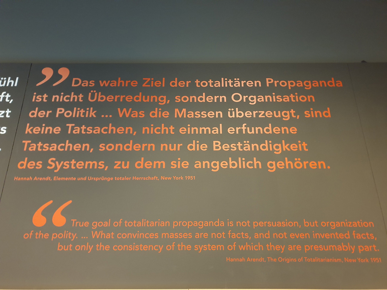 영주의 간섭을 일절 받지 않았던 중세 자유도시 시절을 구현한 미니어처가 먼저 보였다. ‘바쁜 삶과 이동의 자유가 있는, 미국처럼 보이는 첫 번째 도시’라는 문구도 있었다 (1860년대 미국 대사의 기록이라 한다). 독일 제2제국 시절의 제국 깃발과 누구나 알아볼 만큼 강렬한 나치의 하켄크로이츠. 그리고 정치철학자 한나 아렌트의 ‘전체주의란 무엇인가’를 정의한 문장이 있었다. 광기에 의해 개인이 집단으로 흡수되고 집단이 다시 개인으로 흩어지는 과정이었다.