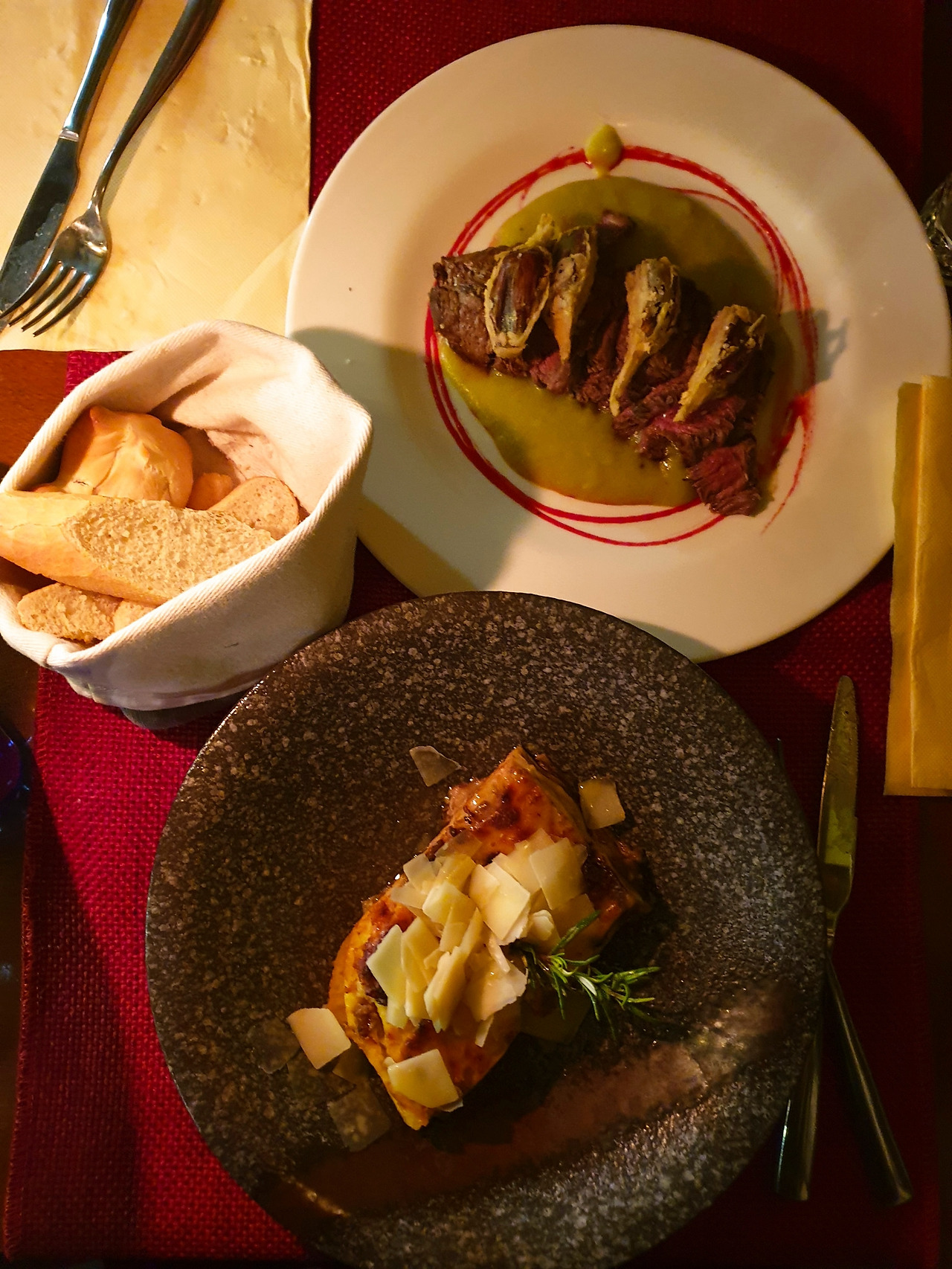 따뜻한 내부로 들어가 주문한 라자냐와 소고기 탈리아타를 메인으로 먹었다. 좀 떨떠름함이 남아있었지만 요리는 그래도 요리였다. 두 명이서 60유로면 친절한 안내자에 대한 대접으로 그리 비싸진 않았다.