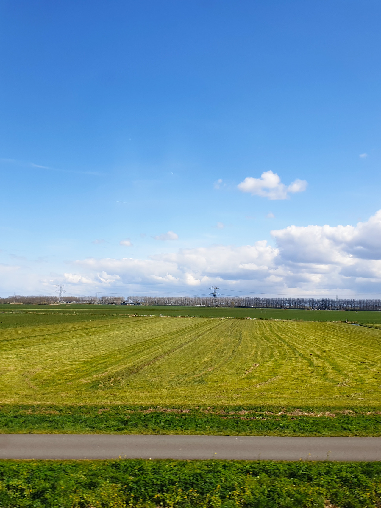 상식으로 네덜란드가 '낮은 땅'이고 나라 전체가 완만한 평지인 건 알고 있었지만, 이 당시엔 별 기대가 없었다. 열차가 국경을 넘을 무렵이 되어서야 왜 독일과 네덜란드가 다른 나라인지 알았다. 국경 근처에서 한순간에 지형이 바뀌었다. 독일에서 익숙했던 흐린 하늘 아래 거뭇거뭇한 산과 숲이 아닌, 지평선이 보이는 들판이 펼쳐졌다.