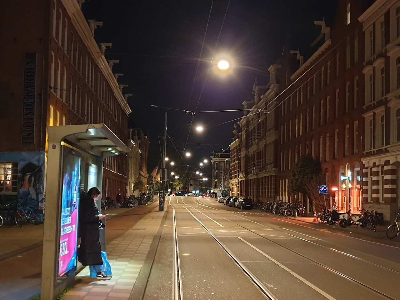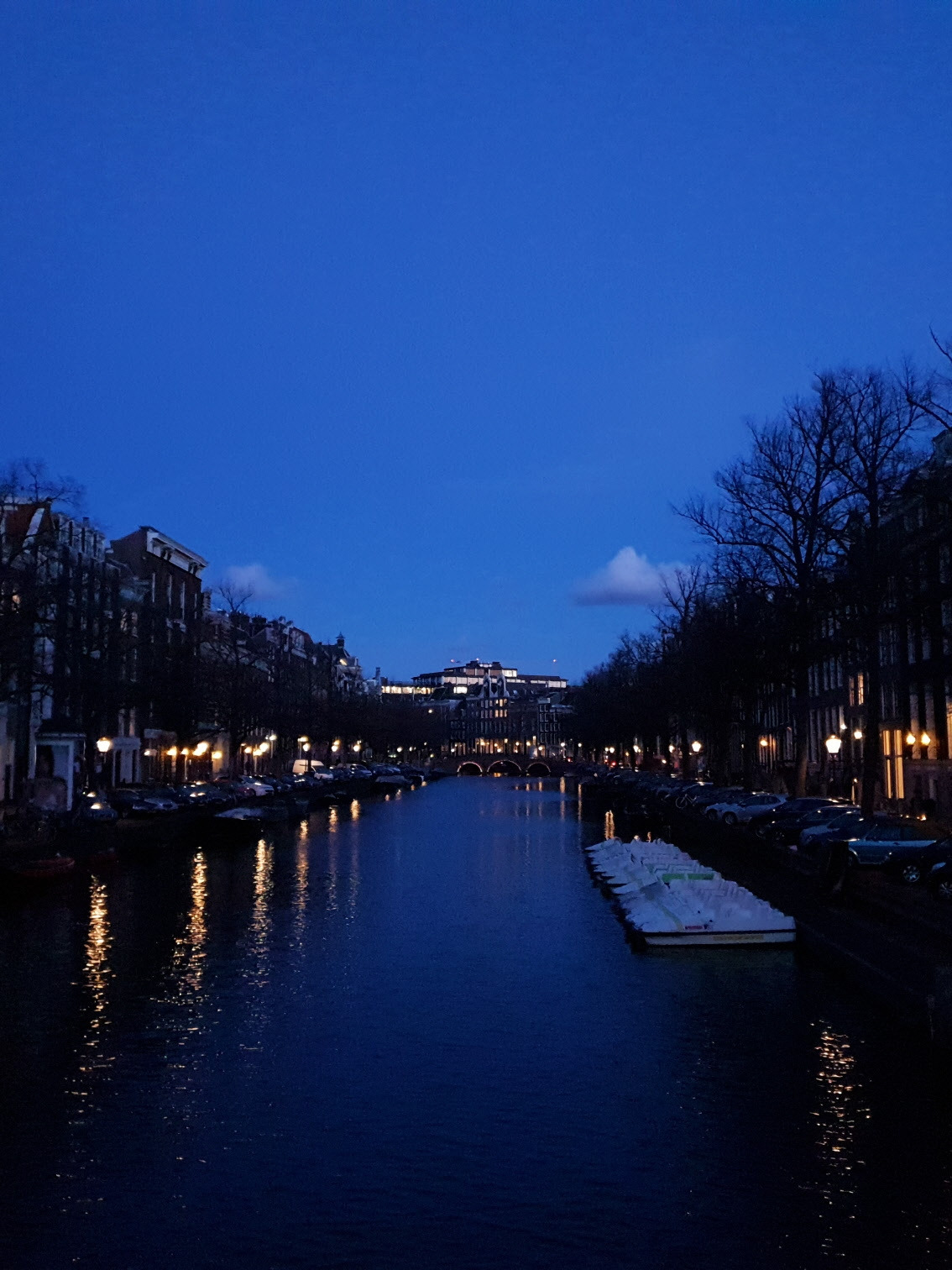 다행히 늦지 않은 시간에 울린 카톡 알림에 깼고, 아직 석양빛이 남아있는 암스테르담 거리를 돌아볼 시간이 충분히 있었다. 다시 트램 역으로 향했고, 거기에서 중심가로 이동할 때 즈음엔 해는 완전히 졌지만 저녁 하늘엔 암흑 직전의 검푸름이 남아있었다. 땅거미가 진 구시가지의 운하와 건물들은 오후의 활기와는 다른 조용하고 안정적인 정서를 자아내고 있었다.