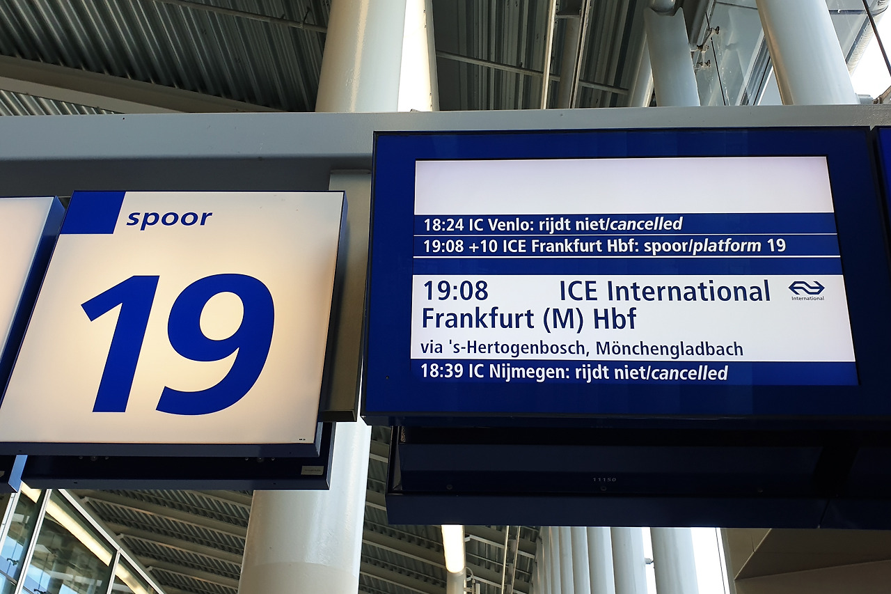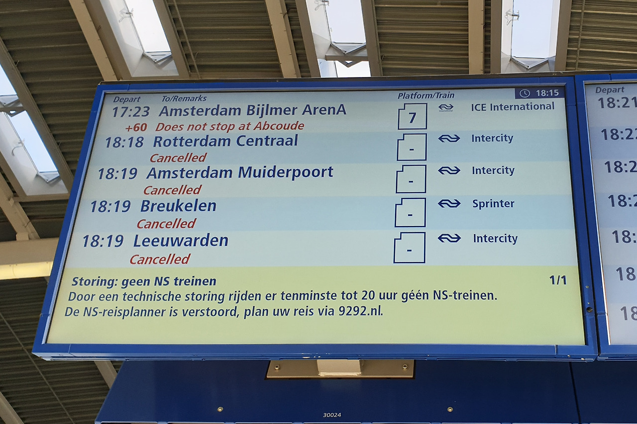 중앙역에서 나와 M표지판을 따라 내려갔다. 다행히 도시 전철은 NS 전산망과 별개라 정상 운행 중이었다. 남쪽 암스텔역 방향 노선에 탔다. 그곳은 살아있을지 모른다는 일말의 기대를 가지고. 10분 남짓한 이동 시간 후, 전철에서 내리자마자 도시 간 열차 플랫폼 전광판을 확인했다.