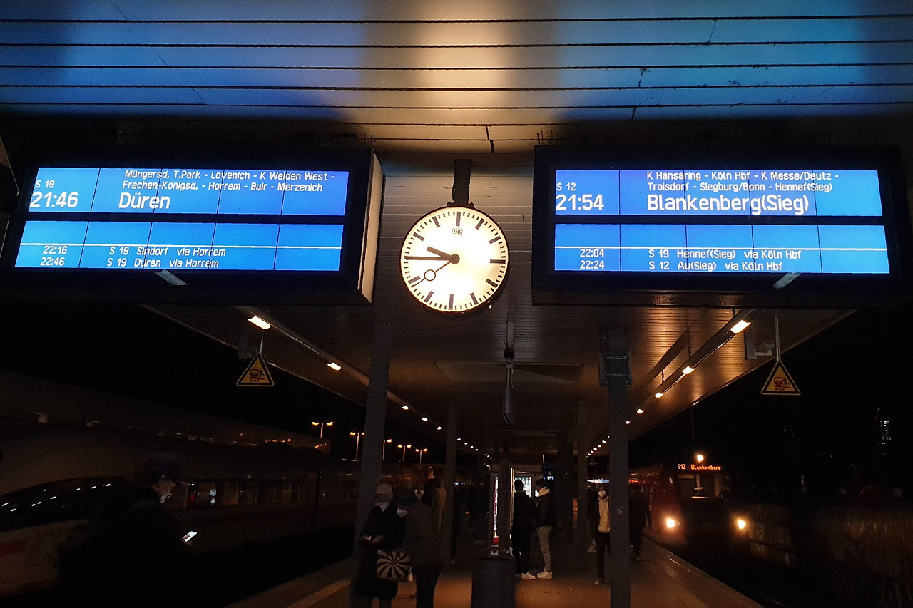 전광판에는 쾰른 중앙역으로 가는 S-Bahn 열차가 밤 9시 54분에 온다고 나왔다.