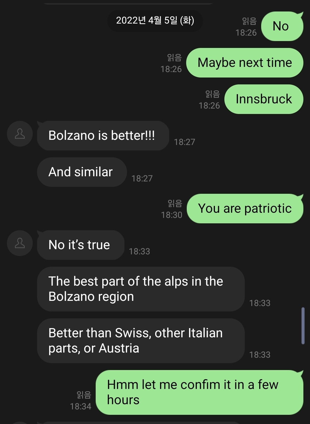 ‘볼차노가 더 좋아! 알프스에서 최고의 지역은 볼차노거든. 스위스나 오스트리아의 다른 알프스 지역보다 훨씬 나아. 국경을 지나면 어떻게 산들이 예뻐지는지 보게 될 거야.’